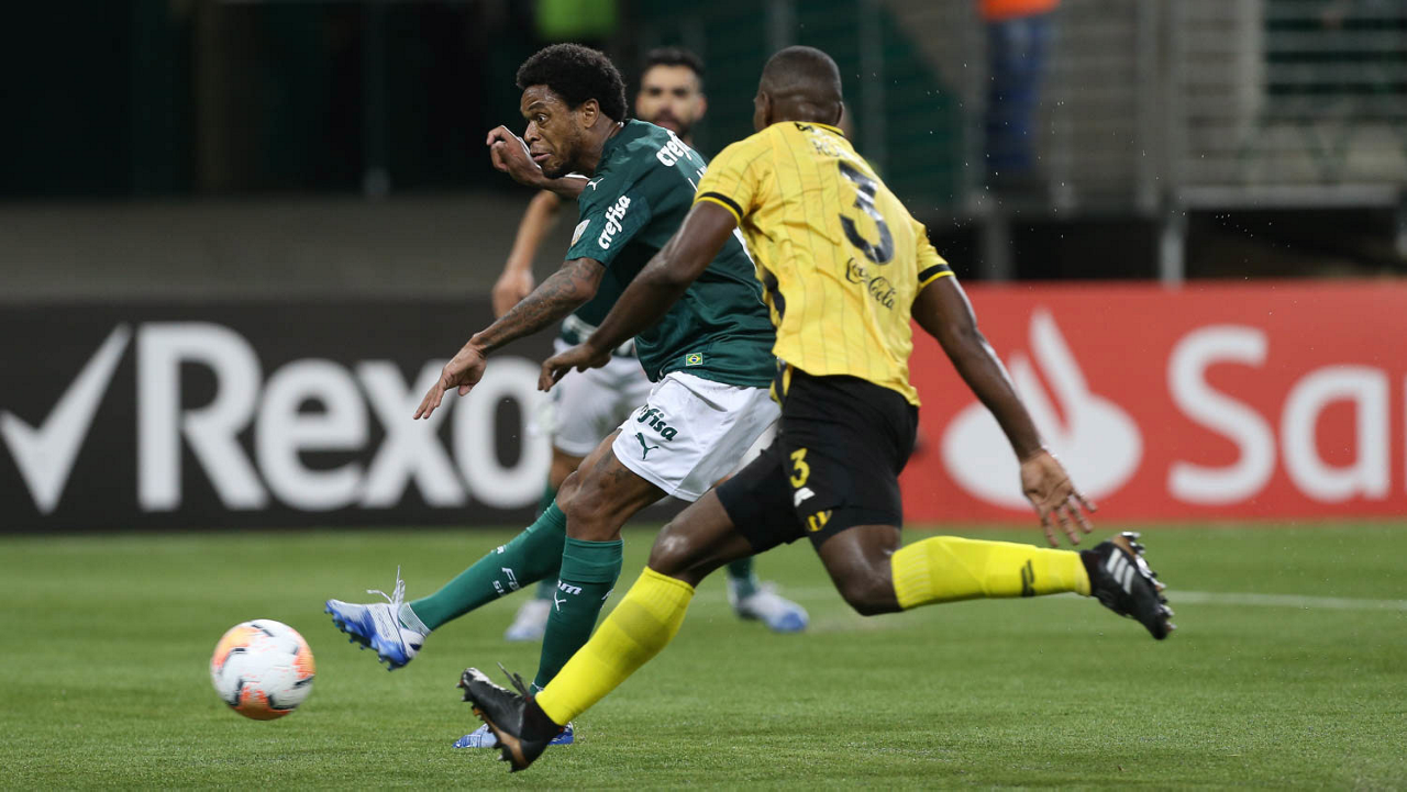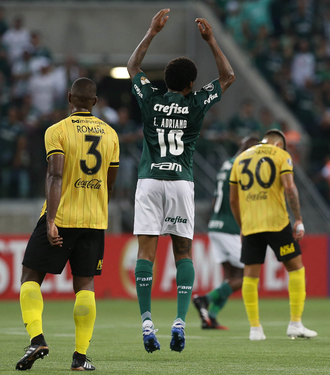 O jogador Luiz Adriano, da SE Palmeiras, disputa bola com o jogador Jorge Morel, do C Guaraní, durante partida válida pela segunda rodada, fase de grupos, da Copa Conmebol Libertadores, na arena Allianz Parque. (Foto: Cesar Greco)