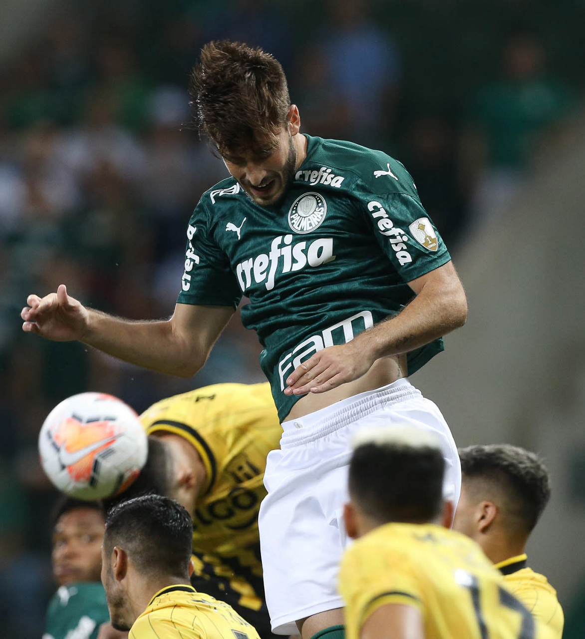 O jogador Gustavo Gómez, da SE Palmeiras, em jogo contra a equipe do C Guaraní, durante partida válida pela segunda rodada, fase de grupos, da Copa Conmebol Libertadores, na arena Allianz Parque. (Foto: Cesar Greco)