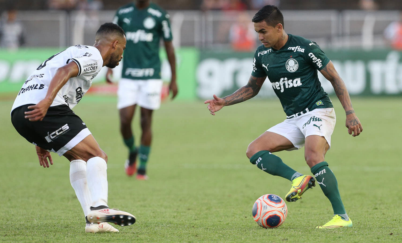 O jogador Dudu, da SE Palmeiras, disputa bola com o jogador Thomaz, da AA Internacional-Limeira, durante partida válida pela décima rodada, do Campeonato Paulista, Série A1, no Estádio Major José Levy Sobrinho. (Foto: Cesar Greco)