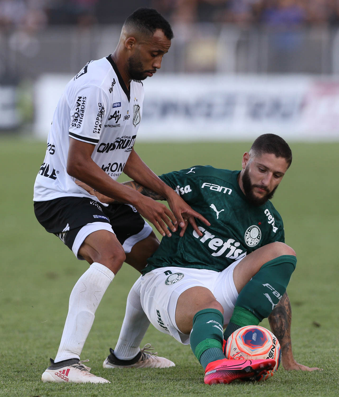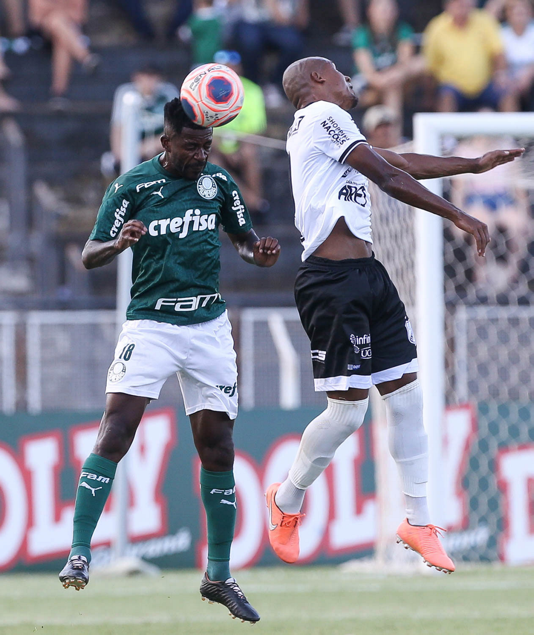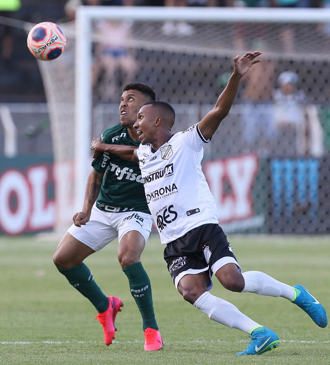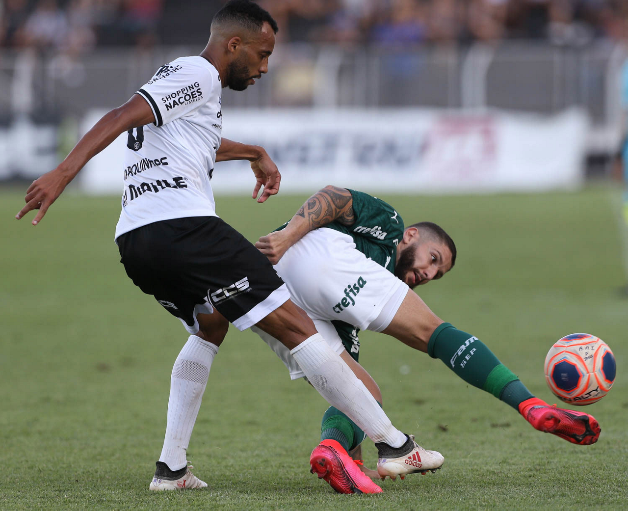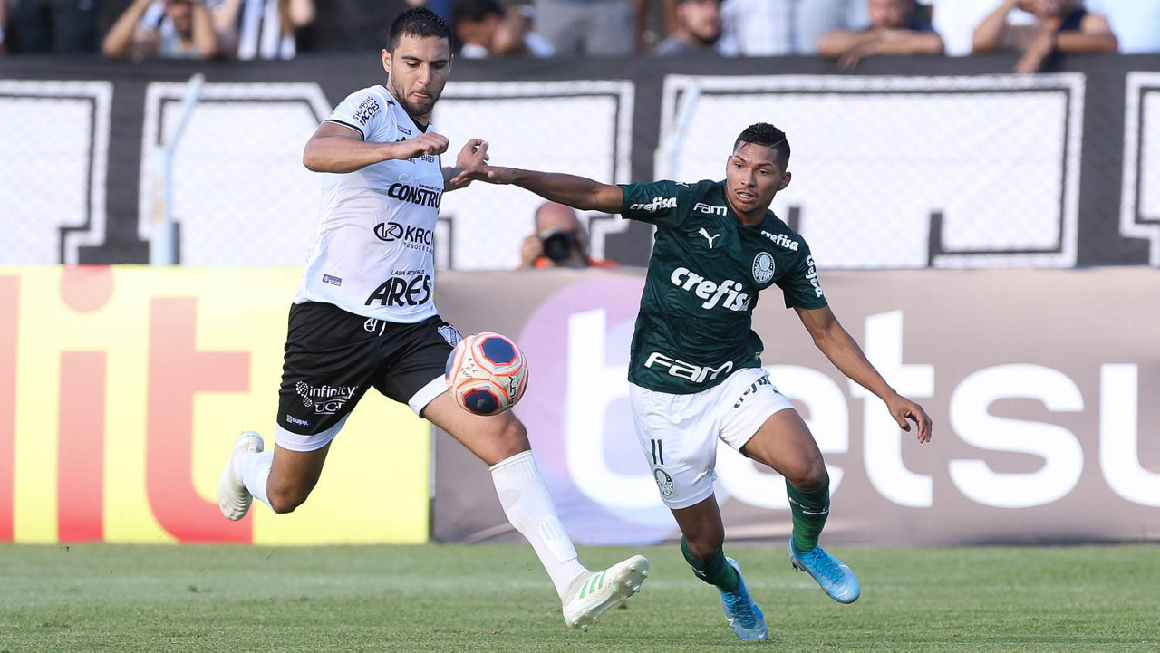 O jogador Rony, da SE Palmeiras, disputa bola com o jogador Léo, da AA Internacional-Limeira, durante partida válida pela décima rodada, do Campeonato Paulista, Série A1, no Estádio Major José Levy Sobrinho. (Foto: Cesar Greco)
