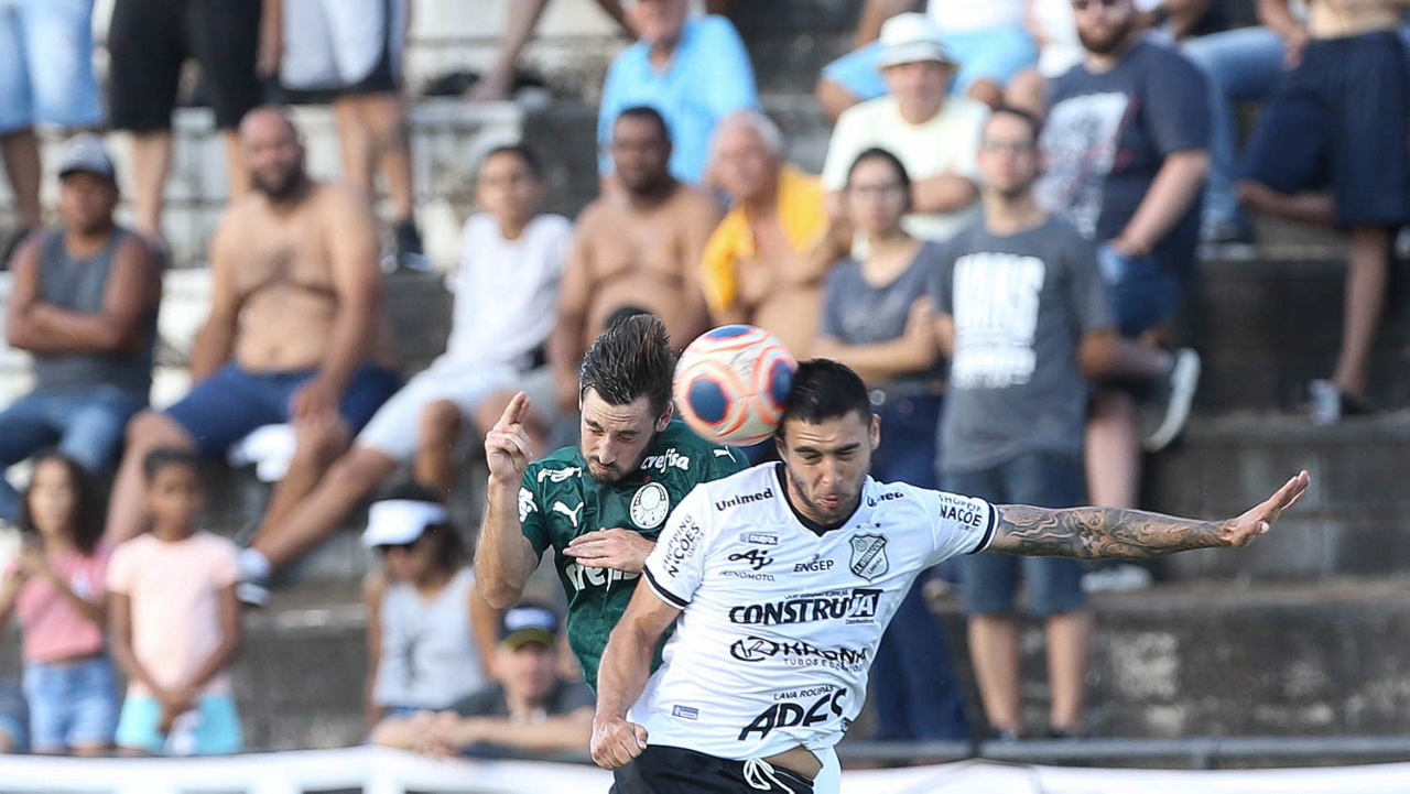 O jogador Matías Viña, da SE Palmeiras, disputa bola com o jogador Léo, da AA Internacional-Limeira, durante partida válida pela décima rodada, do Campeonato Paulista, Série A1, no Estádio Major José Levy Sobrinho. (Foto: Cesar Greco)