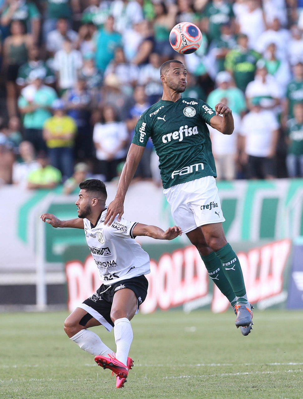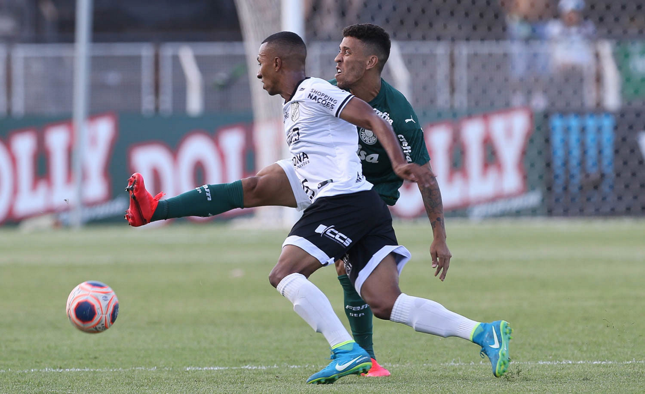 O jogador Marcos Rocha, da SE Palmeiras, disputa bola com o jogador Tcharlles, da AA Internacional-Limeira, durante partida válida pela décima rodada, do Campeonato Paulista, Série A1, no Estádio Major José Levy Sobrinho. (Foto: Cesar Greco)