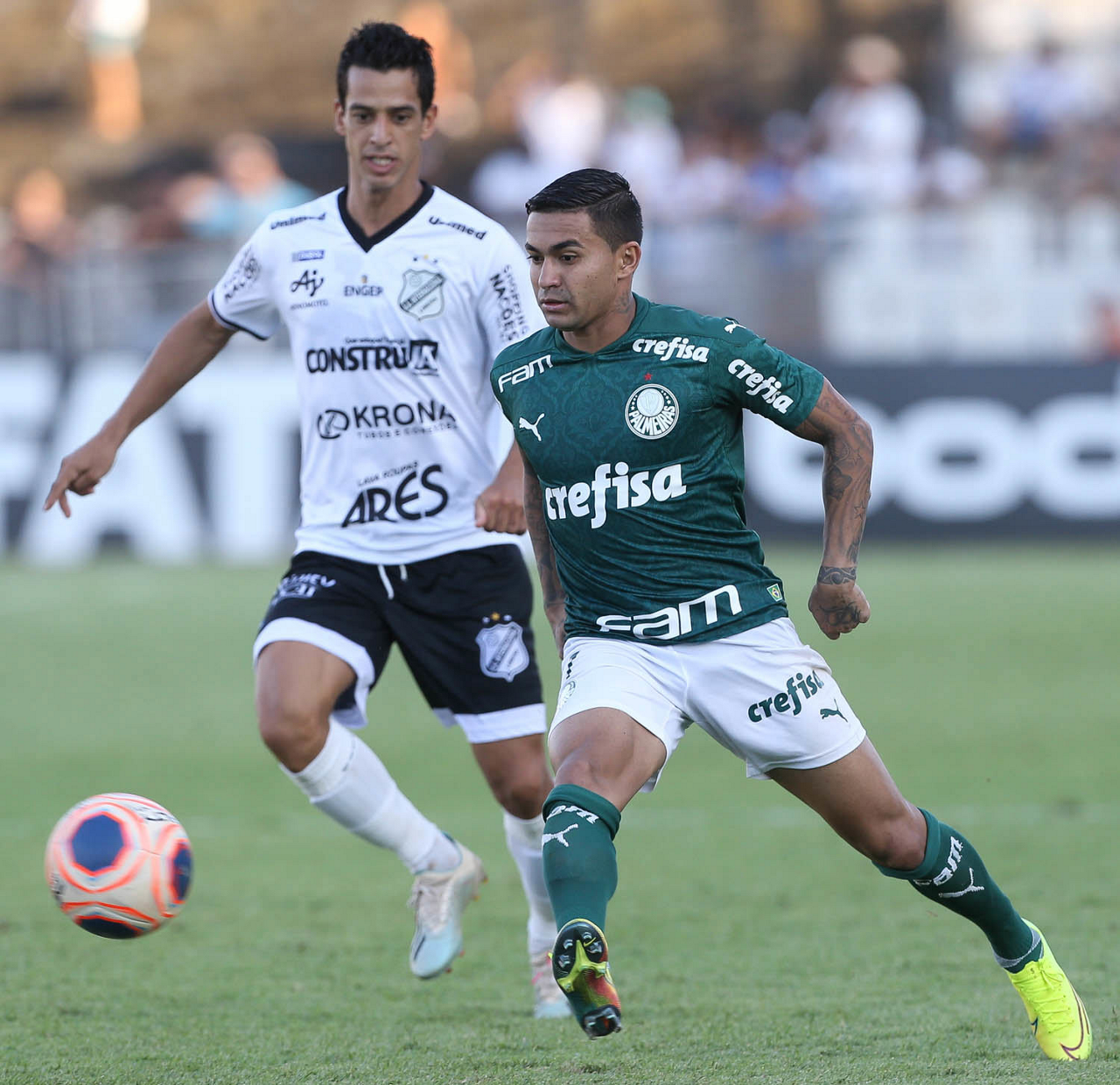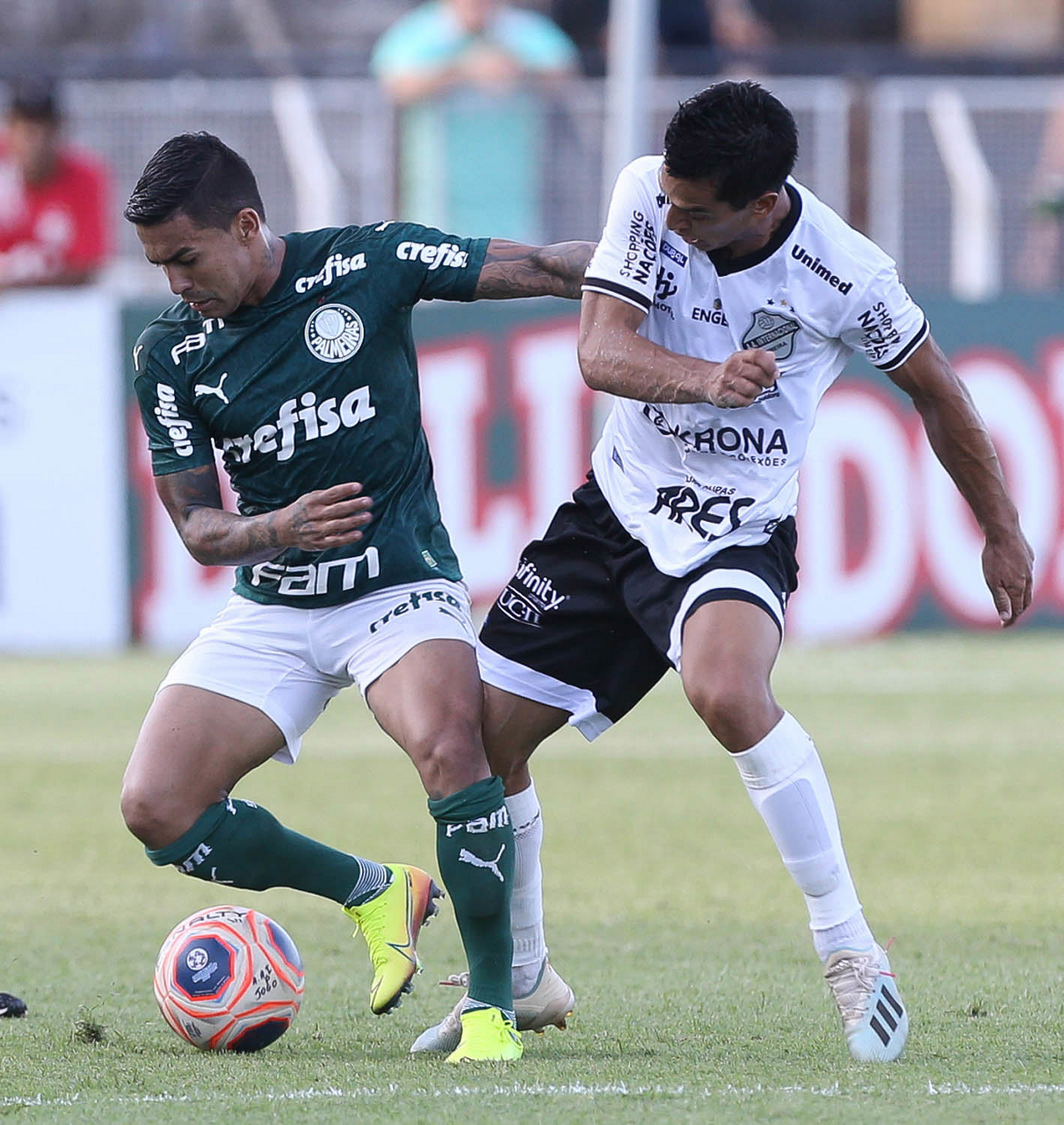 O jogador Dudu, da SE Palmeiras, disputa bola com o jogador, da AA Internacional-Limeira, durante partida válida pela décima rodada, do Campeonato Paulista, Série A1, no Estádio Major José Levy Sobrinho. (Foto: Cesar Greco)