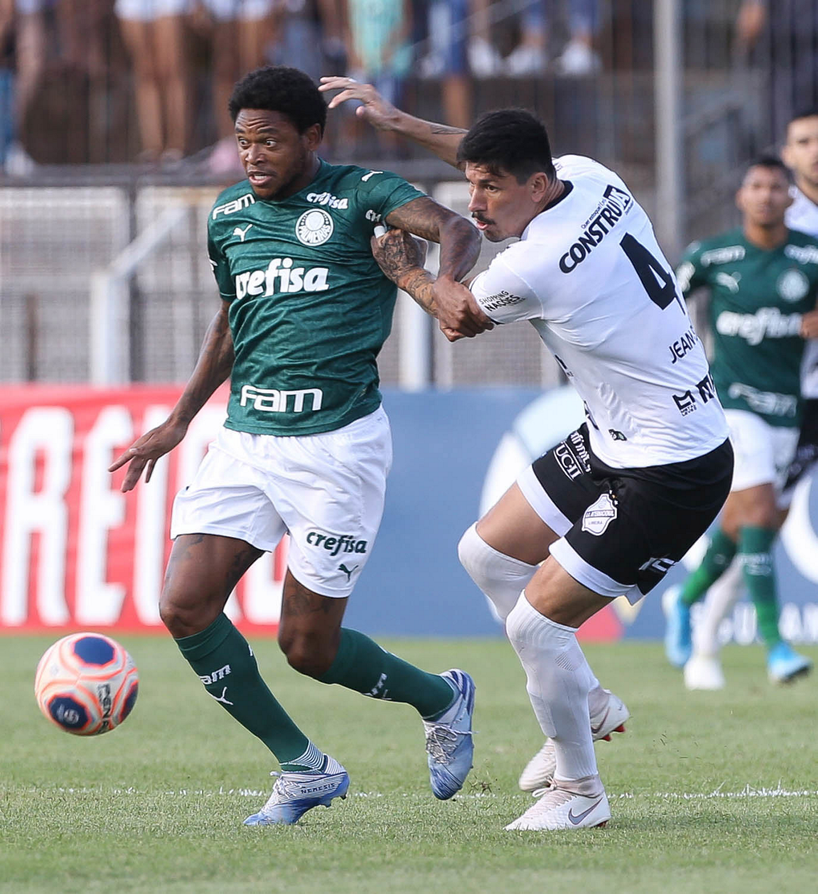 O jogador Luiz Adriano, da SE Palmeiras, disputa bola com o jogador Jean Pablo, da AA Internacional-Limeira, durante partida válida pela décima rodada, do Campeonato Paulista, Série A1, no Estádio Major José Levy Sobrinho. (Foto: Cesar Greco)