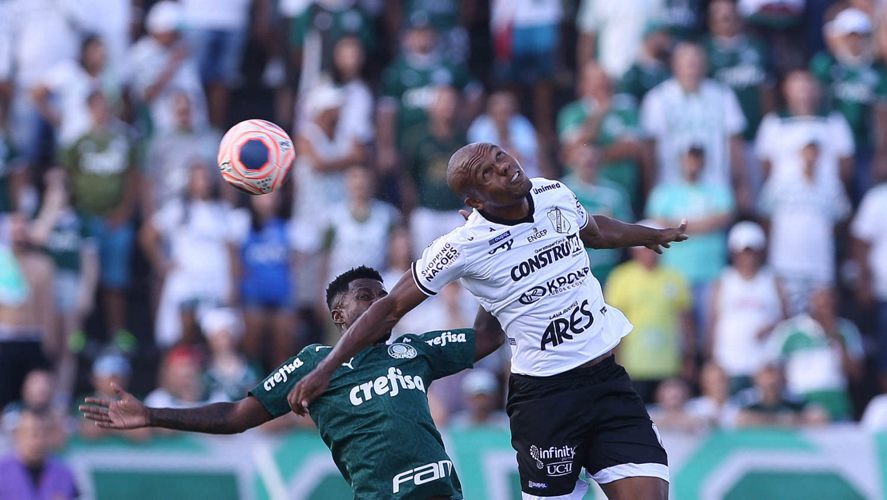 O jogador Marcos Rocha, da SE Palmeiras, disputa bola com o jogador Thomaz, da AA Internacional-Limeira, durante partida válida pela décima rodada, do Campeonato Paulista, Série A1, no Estádio Major José Levy Sobrinho. (Foto: Cesar Greco)