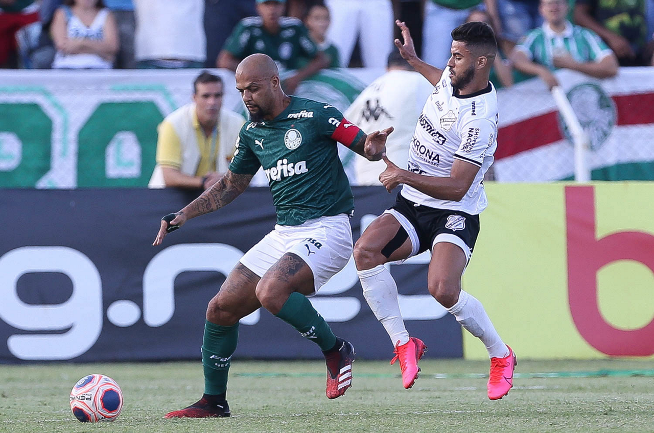 O jogador Felipe Melo, da SE Palmeiras, disputa bola com o jogador Tcharlles, da AA Internacional-Limeira, durante partida válida pela décima rodada, do Campeonato Paulista, Série A1, no Estádio Major José Levy Sobrinho. (Foto: Cesar Greco)