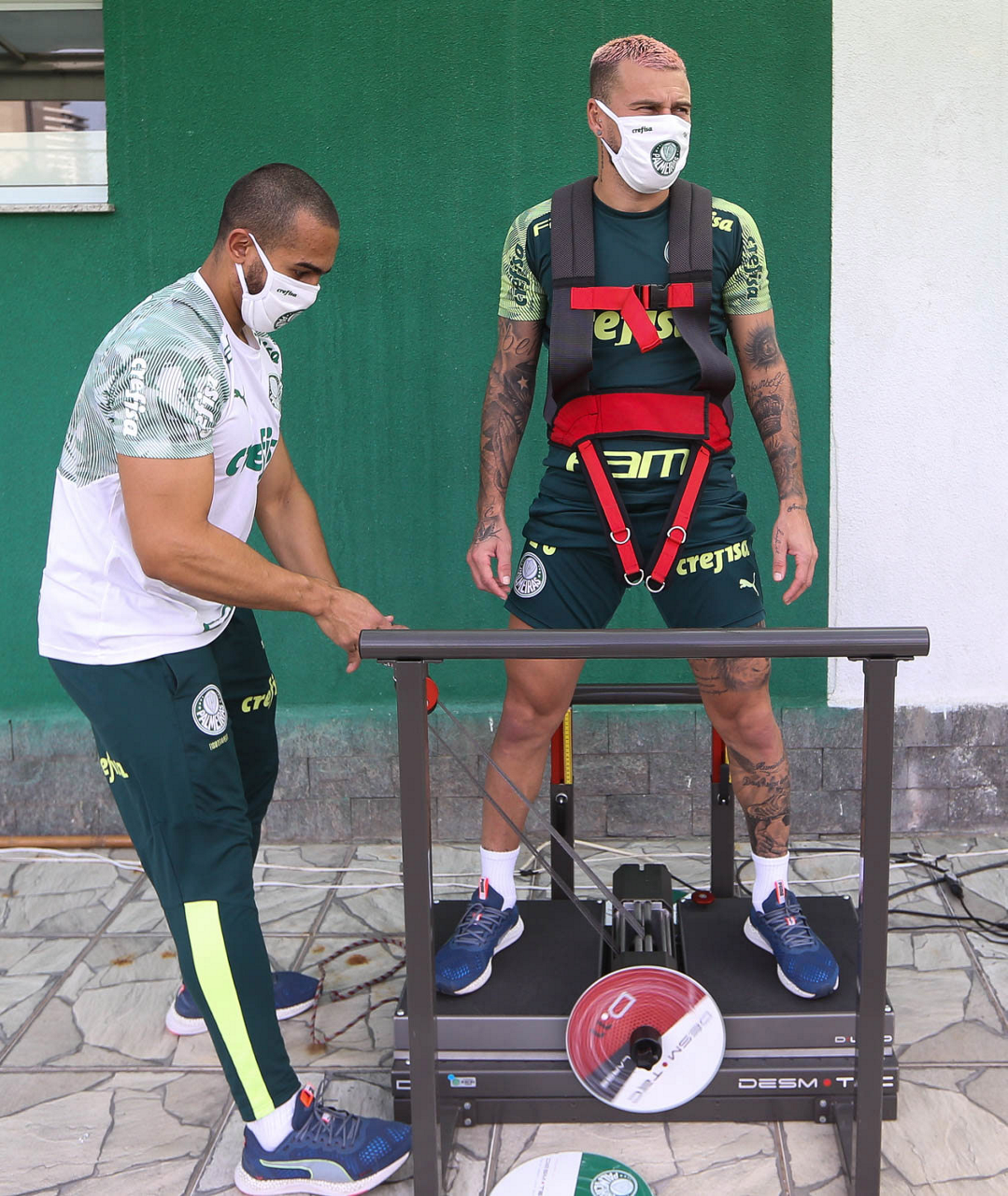 O jogador Matías Viña e o fisioterapeuta Fred Manhães (D), da SE Palmeiras, durante avaliação física, na Academia de Futebol. (Foto: Cesar Greco)