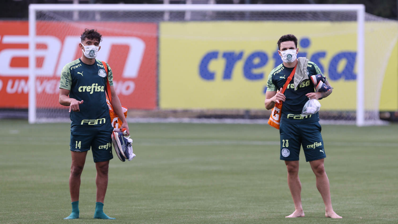 Os jogadores Gustavo Scarpa e Raphael Veiga (D), da SE Palmeiras, durante avaliação física, na Academia de Futebol. (Foto: Cesar Greco)