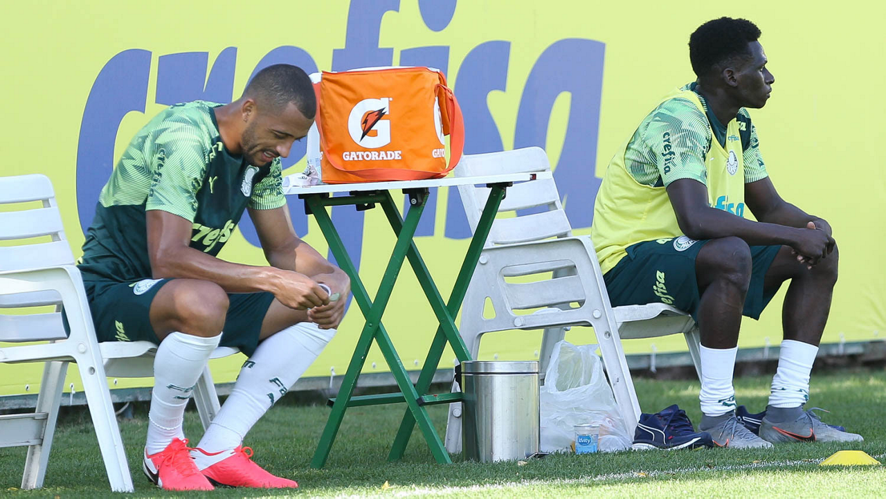 Os jogadores Vitor Hugo e Quiñonez (D), da SE Palmeiras, durante treinamento, na Academia de Futebol. (Foto: Cesar Greco)