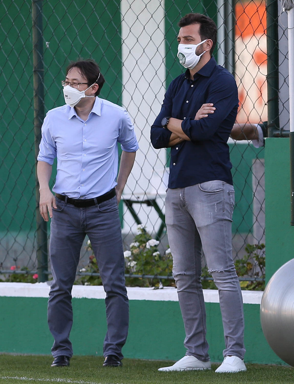 O médico Andre Yamada e o assessor técnico Edu Dracena (D), da SE Palmeiras, durante treinamento, na Academia de Futebol. (Foto: Cesar Greco)