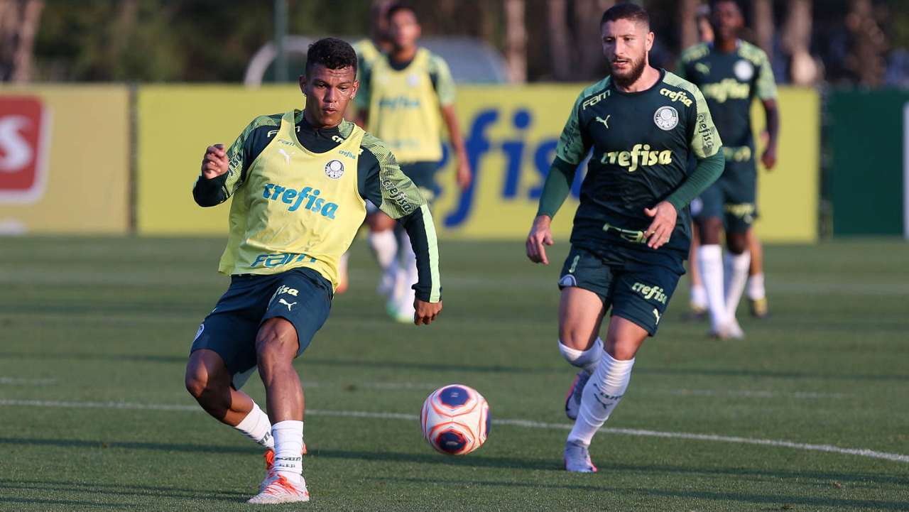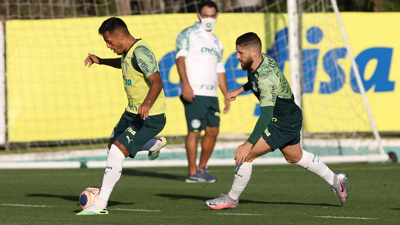 Os jogadores Gabriel Menino e Zé Rafael (D), da SE Palmeiras, durante treinamento, na Academia de Futebol. (Foto: Cesar Greco)