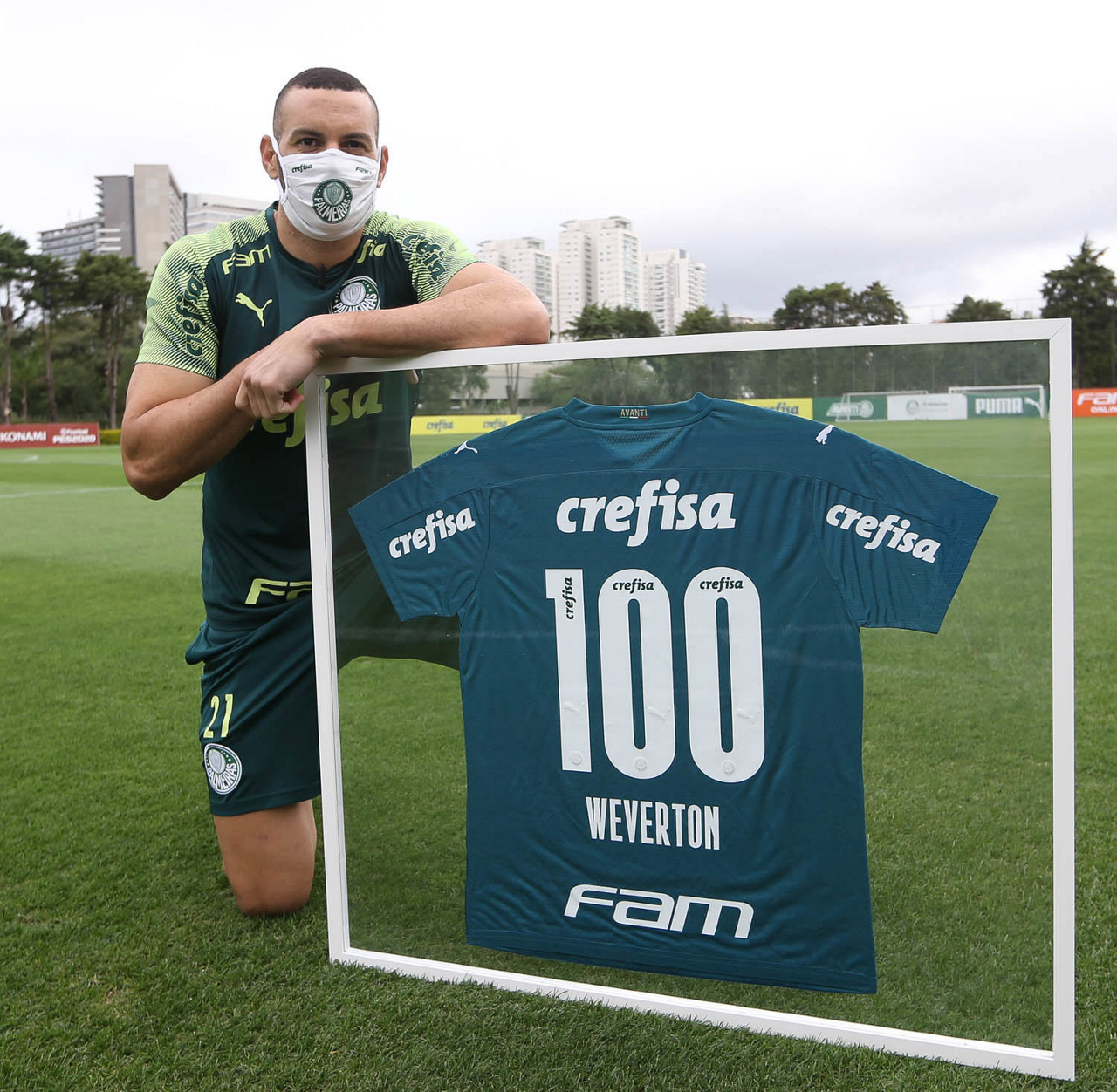 O goleiro Weverton, da SE Palmeiras, recebe camisa em comemoração aos 100 jogos pelo clube, após treinamento, na Academia de Futebol. (Foto: Cesar Greco)