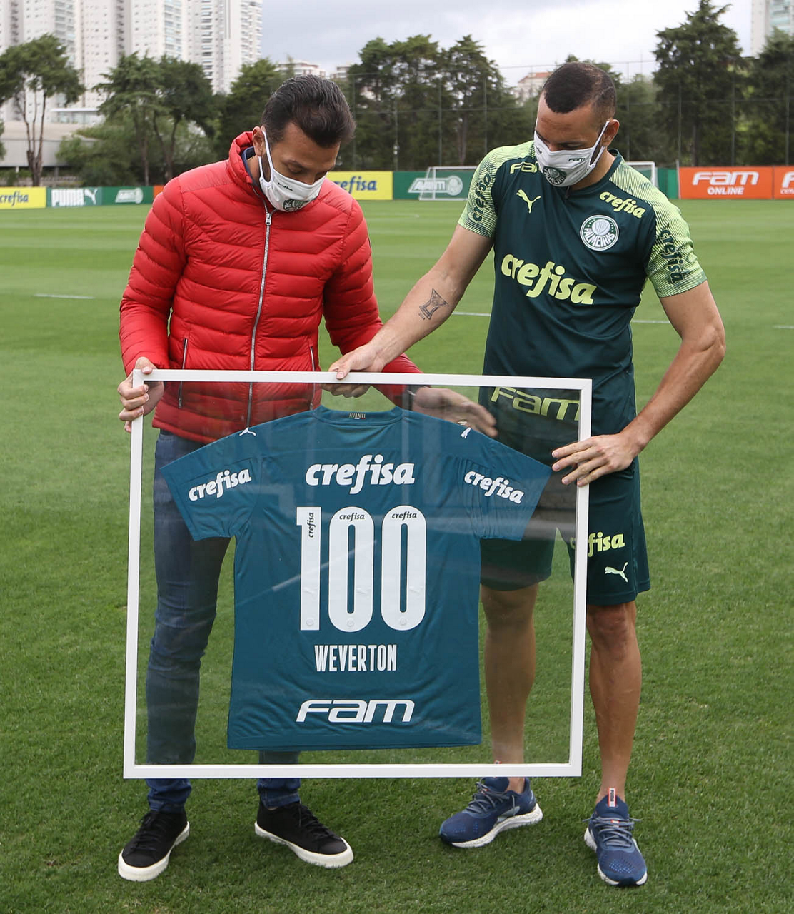 O goleiro Weverton, da SE Palmeiras, recebe camisa em comemoração aos 100 jogos pelo clube, após treinamento, na Academia de Futebol. Na foto O assessor técnico Edu Dracena (E). (Foto: Cesar Greco)