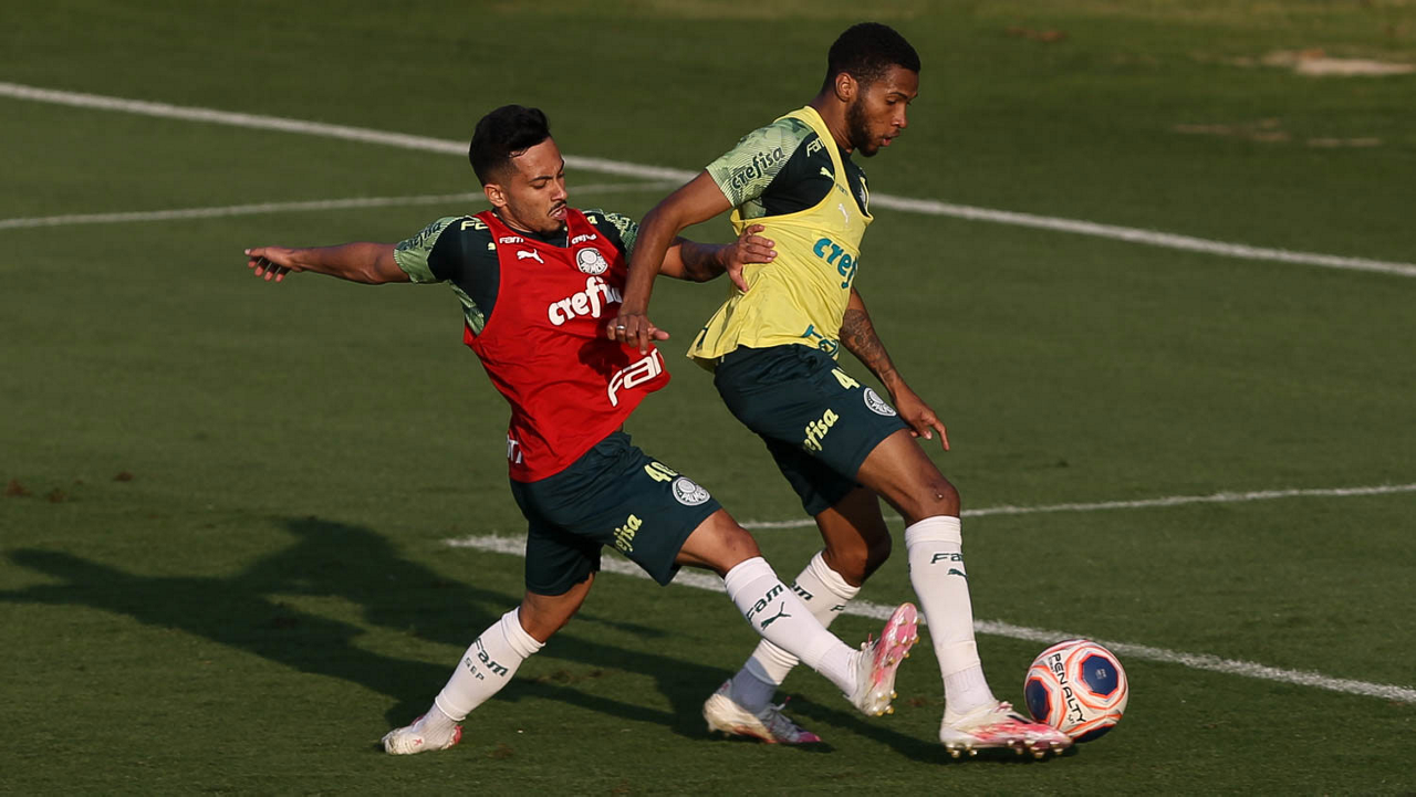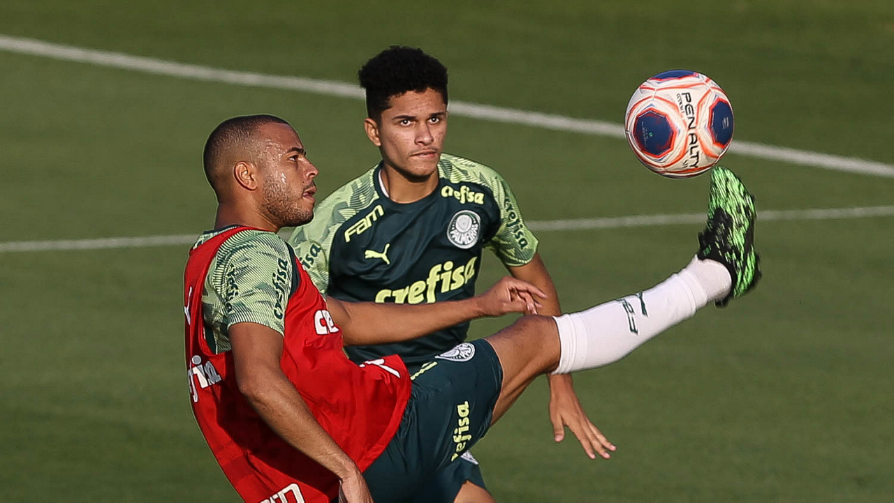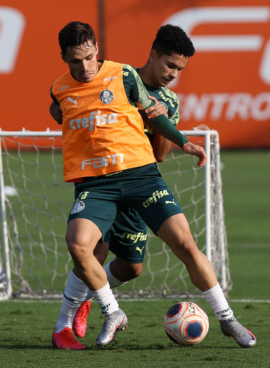 Os jogadores Raphael Veiga e Gabriel Silva (D), da SE Palmeiras, durante treinamento, na Academia de Futebol. (Foto: Cesar Greco)