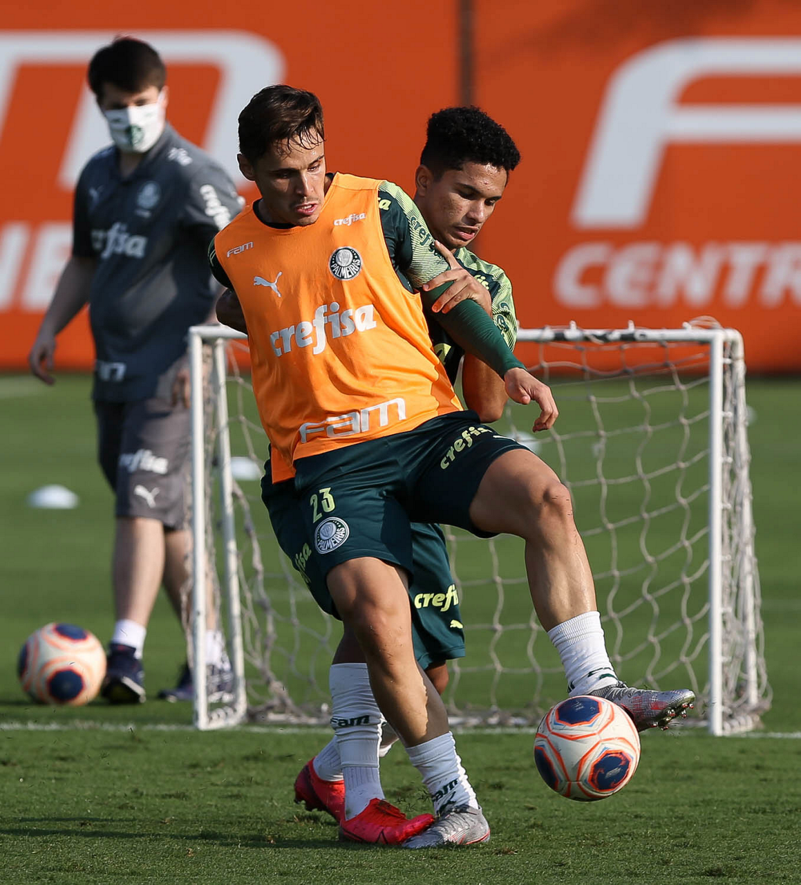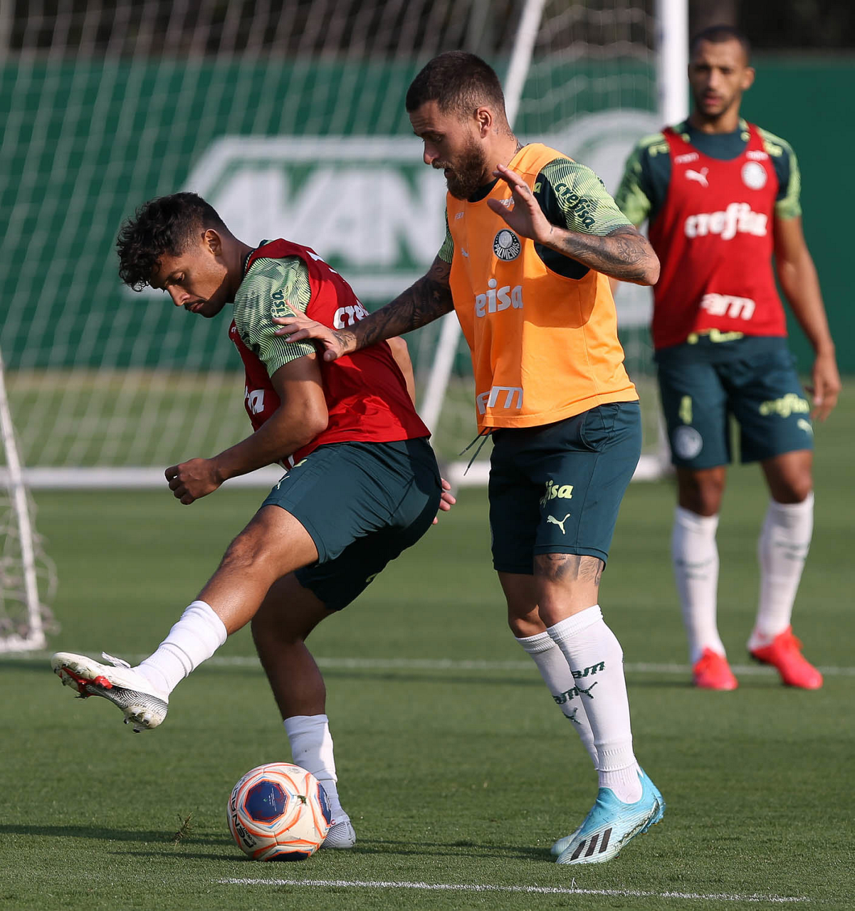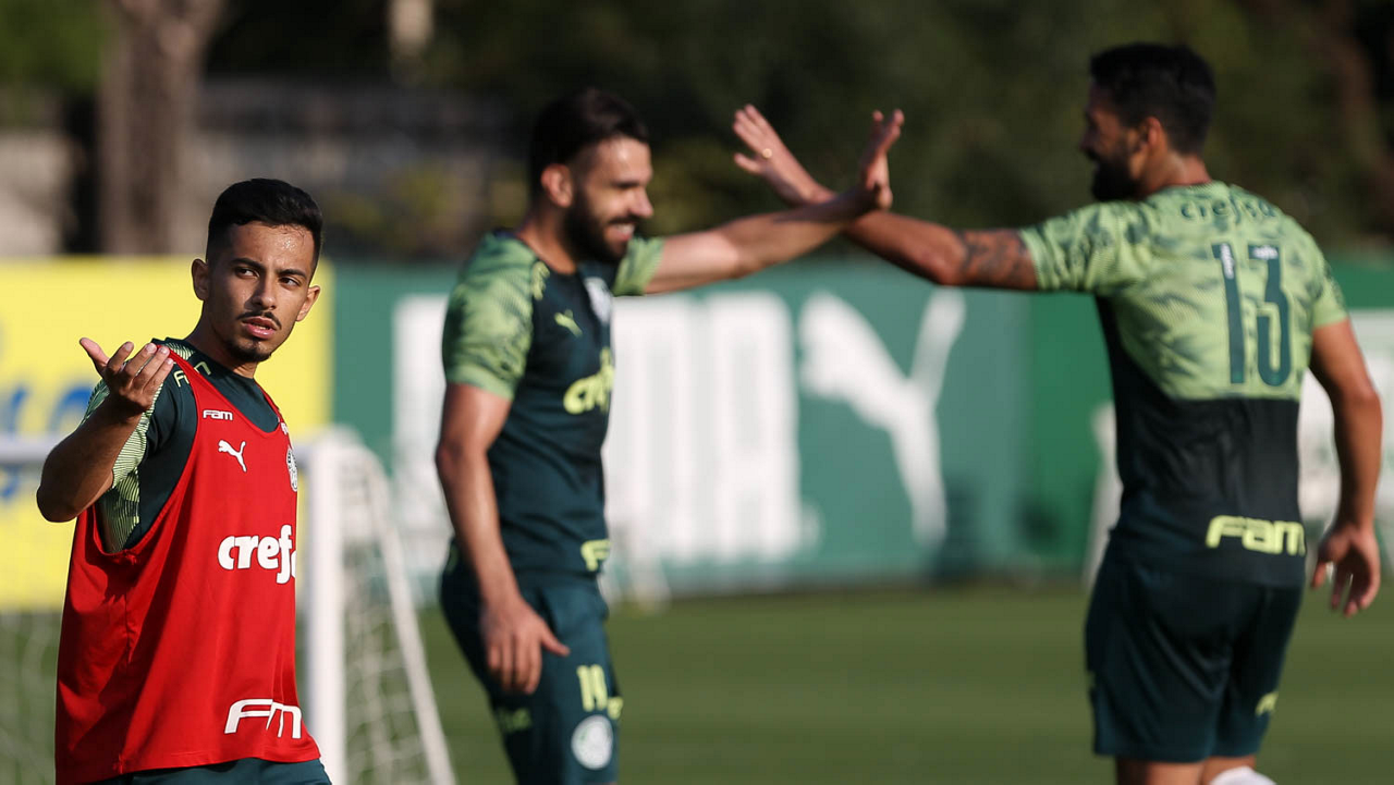 Os jogadores Raphael Veiga e Gabriel Silva (D), da SE Palmeiras, durante treinamento, na Academia de Futebol. (Foto: Cesar Greco)