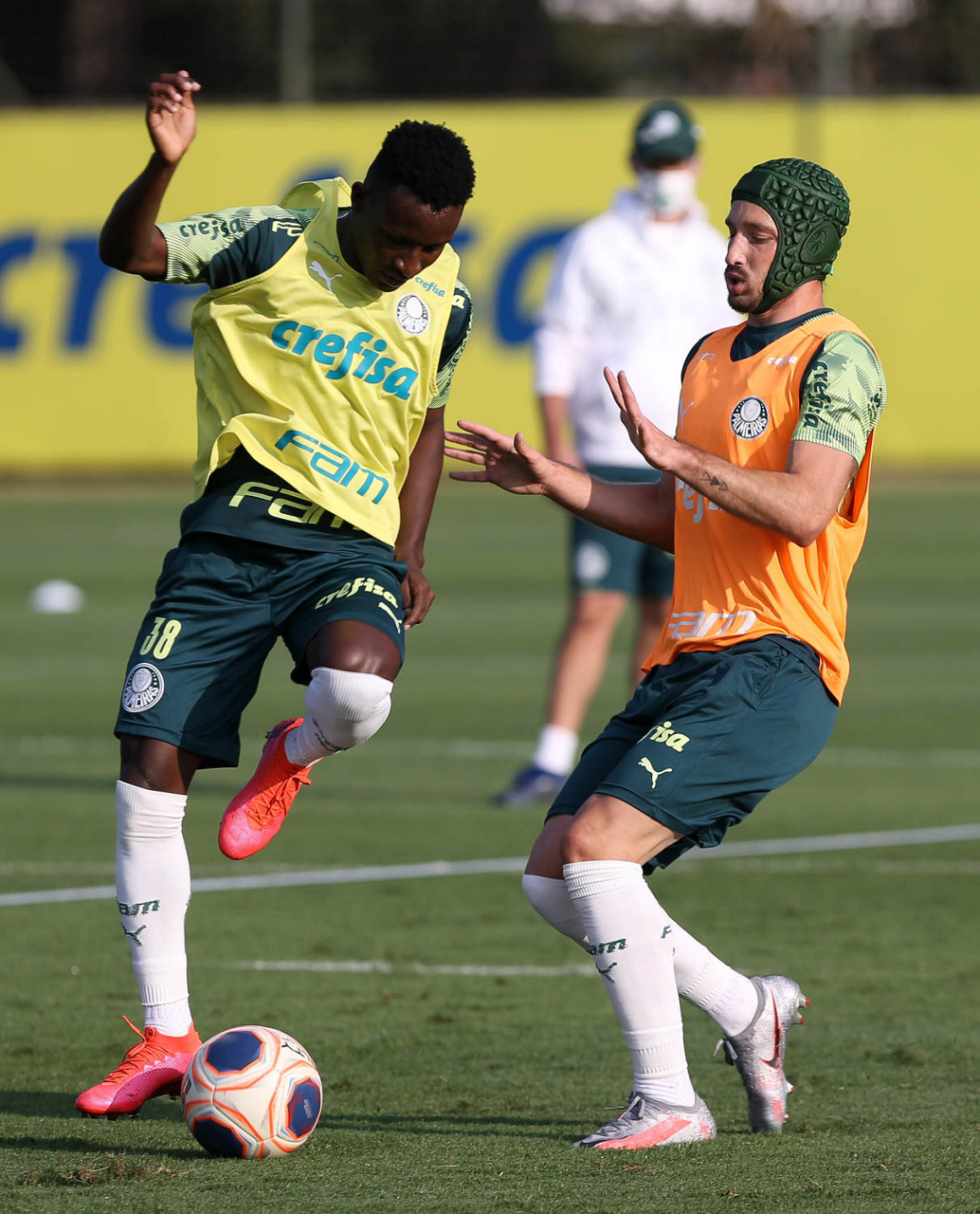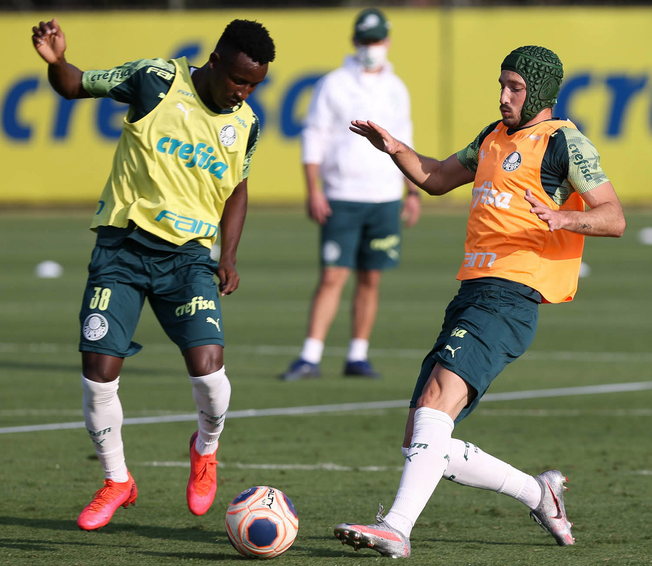 Os jogadores Iván Angulo e Matías Viña (D), da SE Palmeiras, durante treinamento, na Academia de Futebol. (Foto: Cesar Greco)
