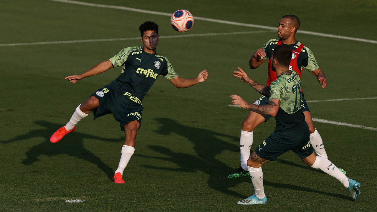 Os jogadores Gabriel Silva, Mayke e Lucas Lima (E/D), da SE Palmeiras, durante treinamento, na Academia de Futebol. (Foto: Cesar Greco)