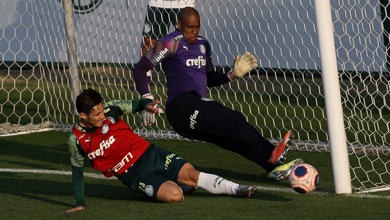 O jogador Raphael Veiga e o goleiro Jailson (D), da SE Palmeiras, durante treinamento, na Academia de Futebol. (Foto: Cesar Greco)