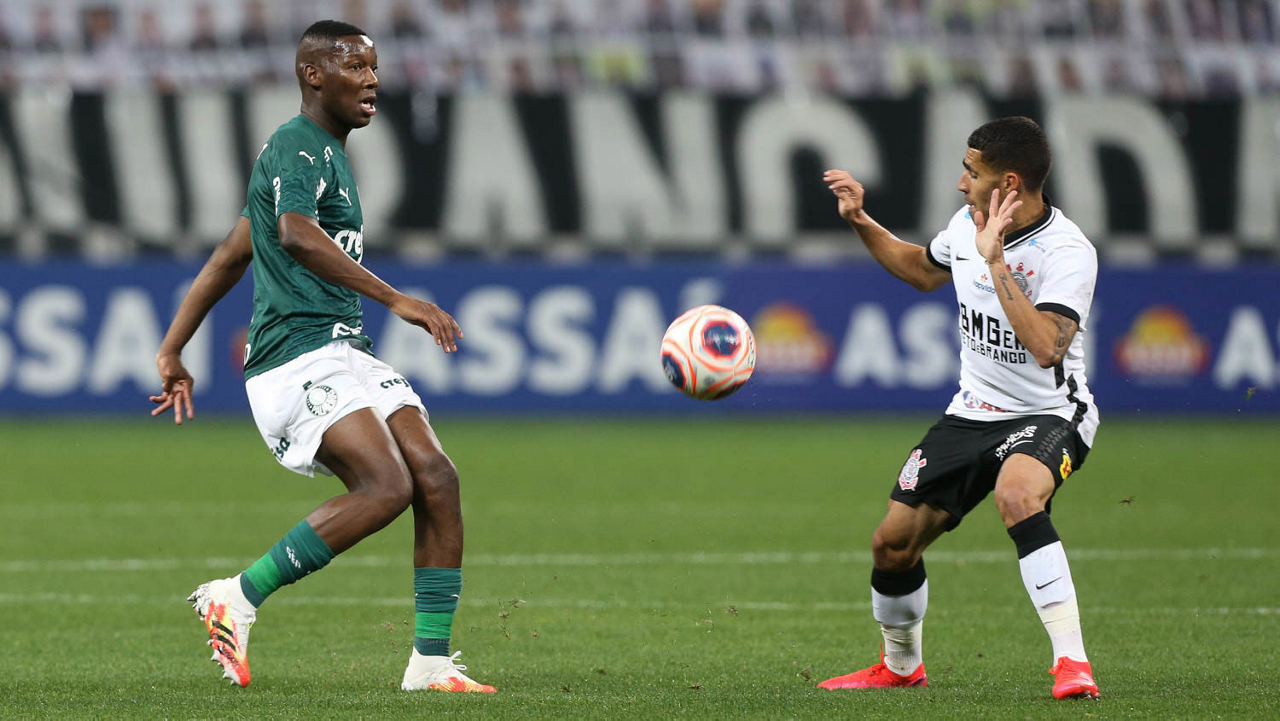 O jogador Gabriel Menino, da SE Palmeiras, disputa bola com o jogador Ramiro, da SC Corinthians P, durante partida válida pela final, ida, do Campeonato Paulista, Série A1, na Arena Corinthians. (Foto: Cesar Greco)
