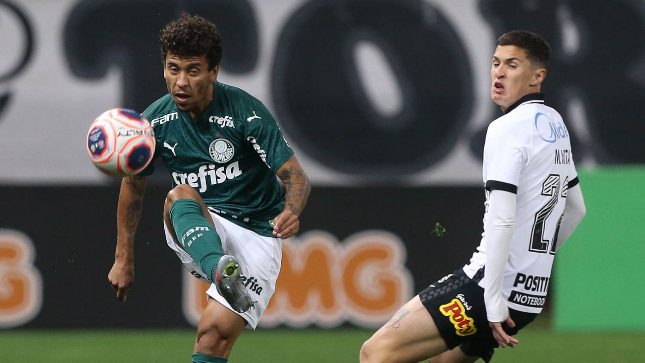 O jogador Marcos Rocha, da SE Palmeiras, disputa bola com o jogador Matheus Vital, da SC Corinthians P, durante partida válida pela final, ida, do Campeonato Paulista, Série A1, na Arena Corinthians. (Foto: Cesar Greco)