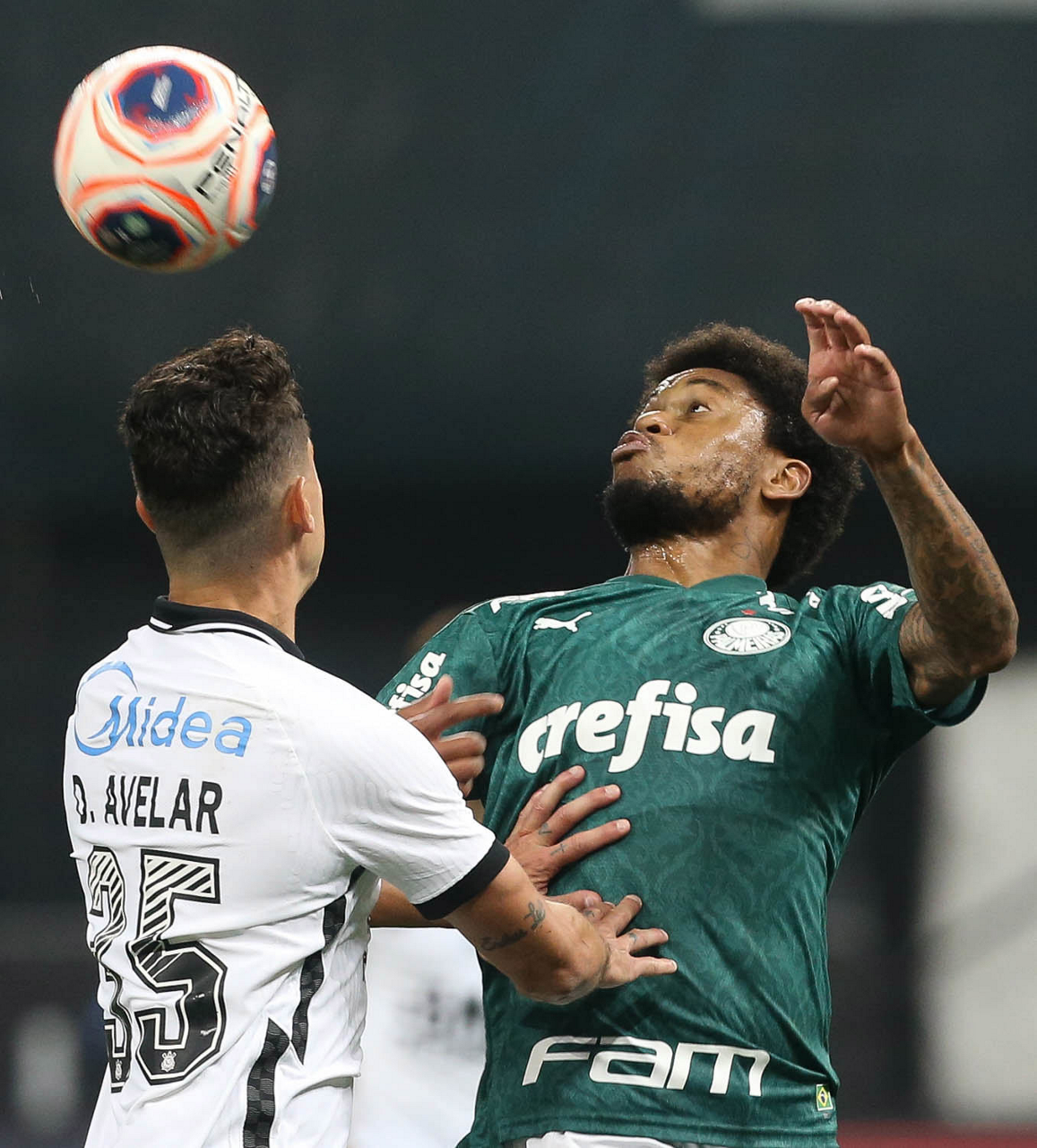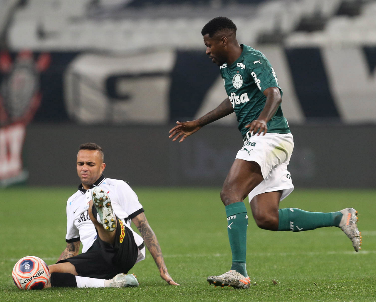 O jogador Gabriel Menino, da SE Palmeiras, disputa bola com o jogador Luan, da SC Corinthians P, durante partida válida pela final, ida, do Campeonato Paulista, Série A1, na Arena Corinthians. (Foto: Cesar Greco)