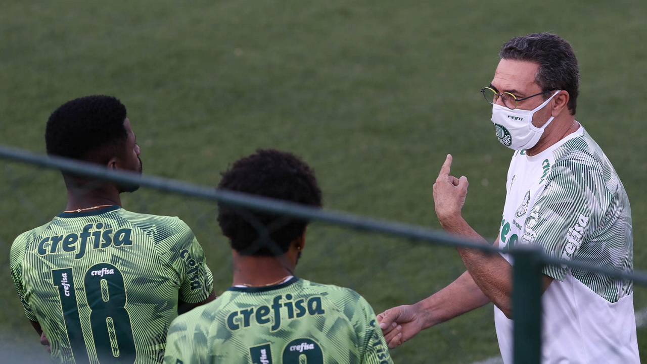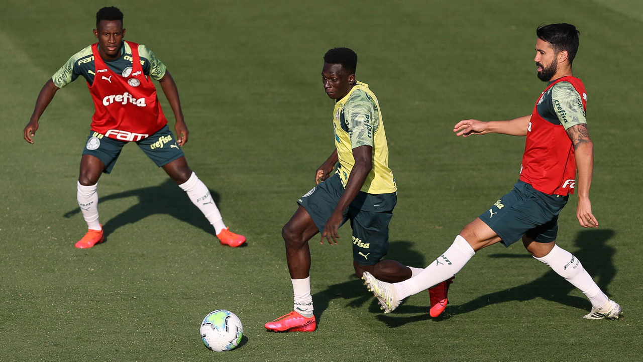Os jogadores Iván Angulo, Quiñonez e Luan (E/D), da SE Palmeiras, durante treinamento, na Academia de Futebol. (Foto: Cesar Greco)
