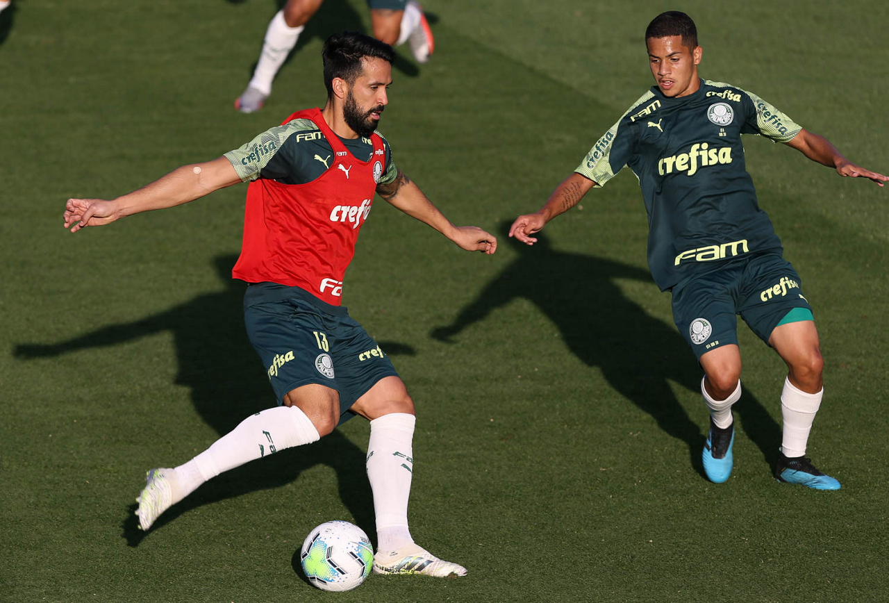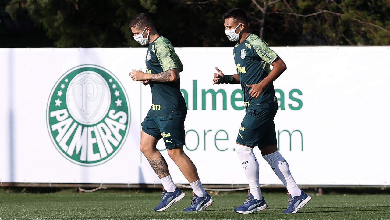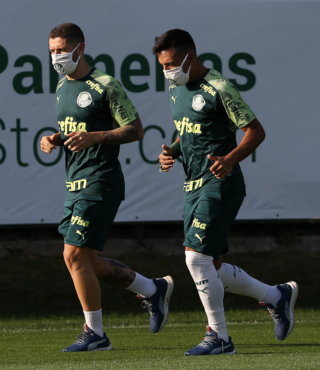 Os jogadores Zé Rafael e Gabriel Menino (D), da SE Palmeiras, durante treinamento, na Academia de Futebol. (Foto: Cesar Greco)