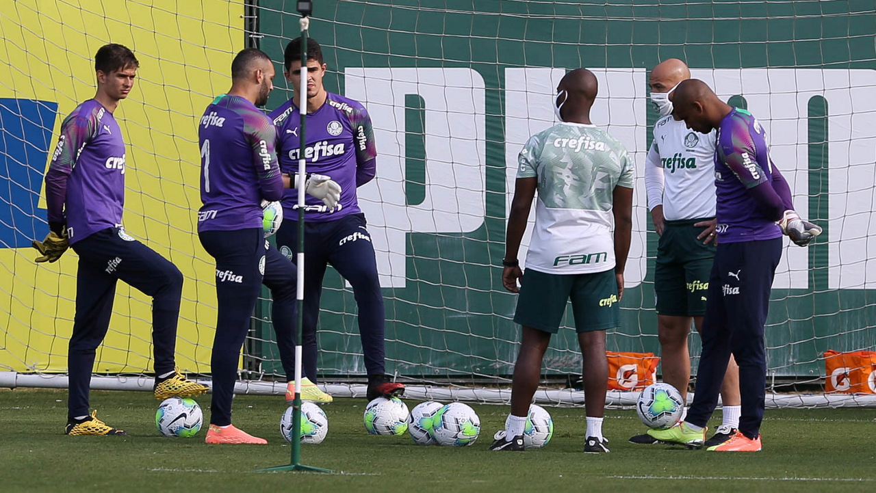 O preparador de goleiro Rogerio Godoy, da SE Palmeiras, conversa com o elenco de goleiros durante treinamento, na Academia de Futebol. (Foto: Cesar Greco)