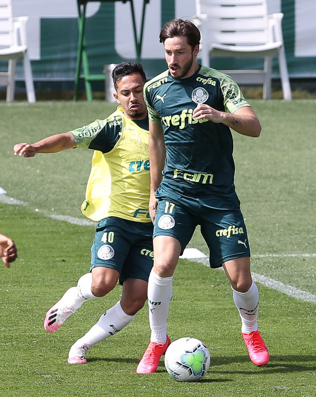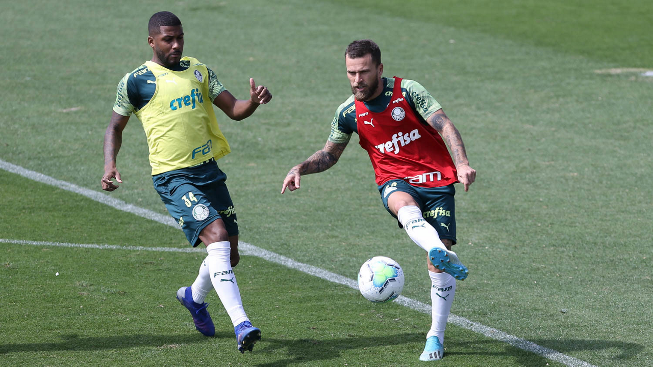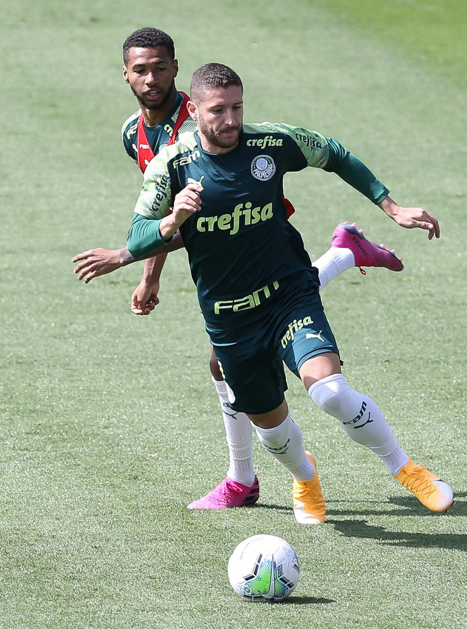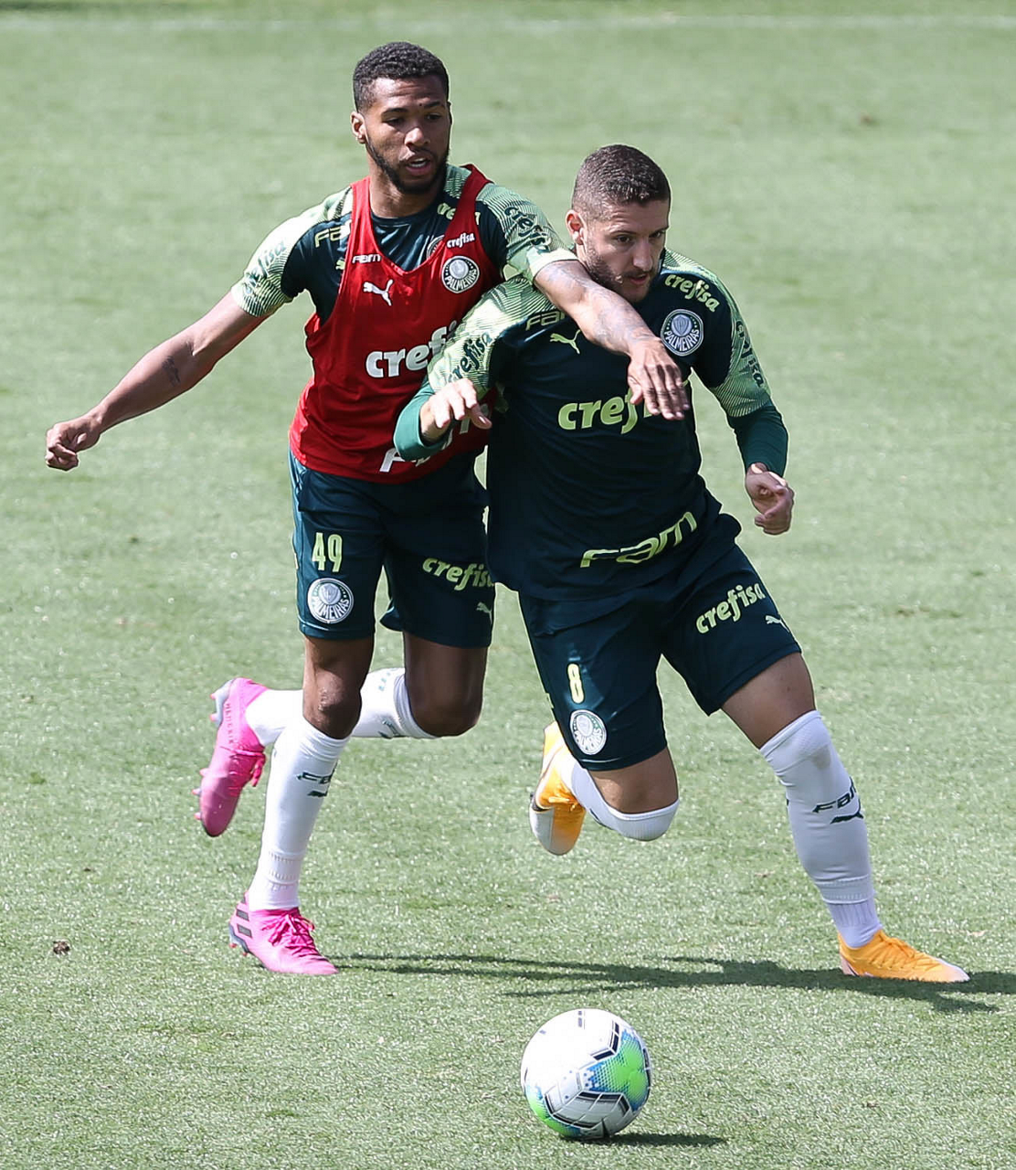 Os jogadores Alan e Matías Viña (D), da SE Palmeiras, durante treinamento, na Academia de Futebol. (Foto: Cesar Greco)