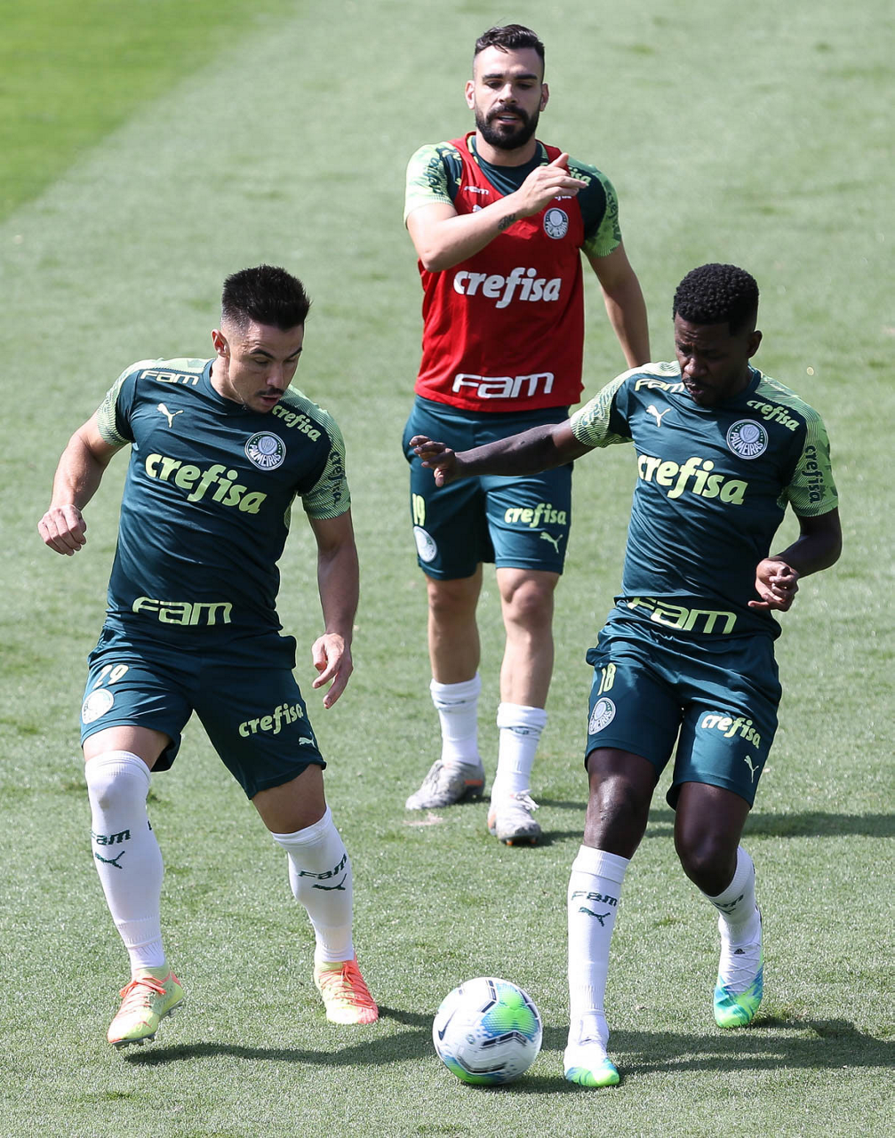 Os jogadores Gustavo Gómez, Mayke e Willian (E/D), da SE Palmeiras, durante treinamento, na Academia de Futebol. (Foto: Cesar Greco)