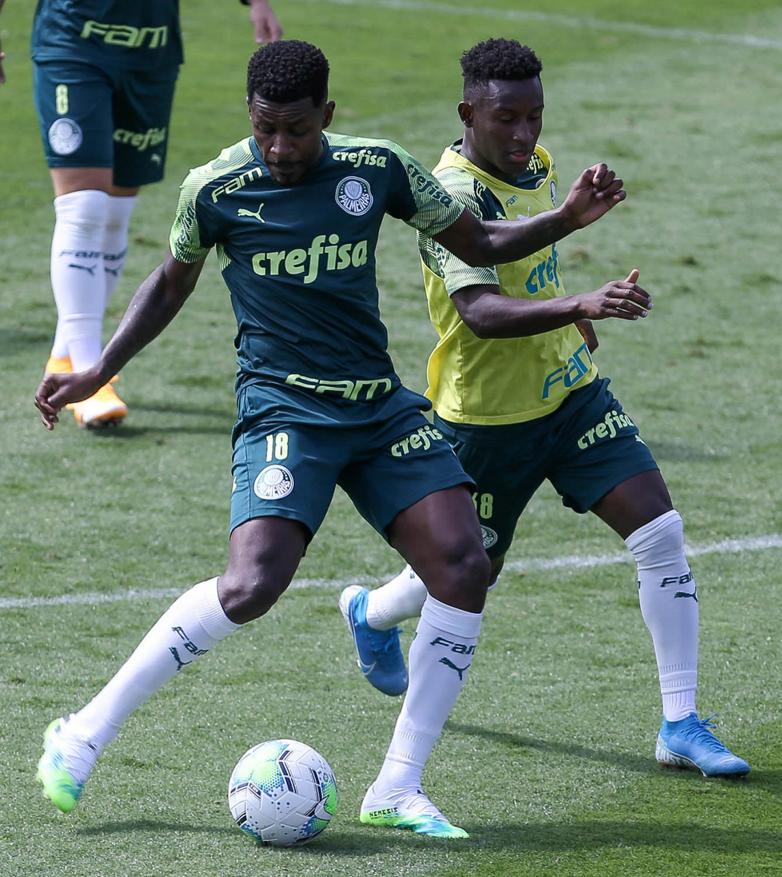 Os jogadores Ramires e Iván Angulo (D), da SE Palmeiras, durante treinamento, na Academia de Futebol. (Foto: Cesar Greco)