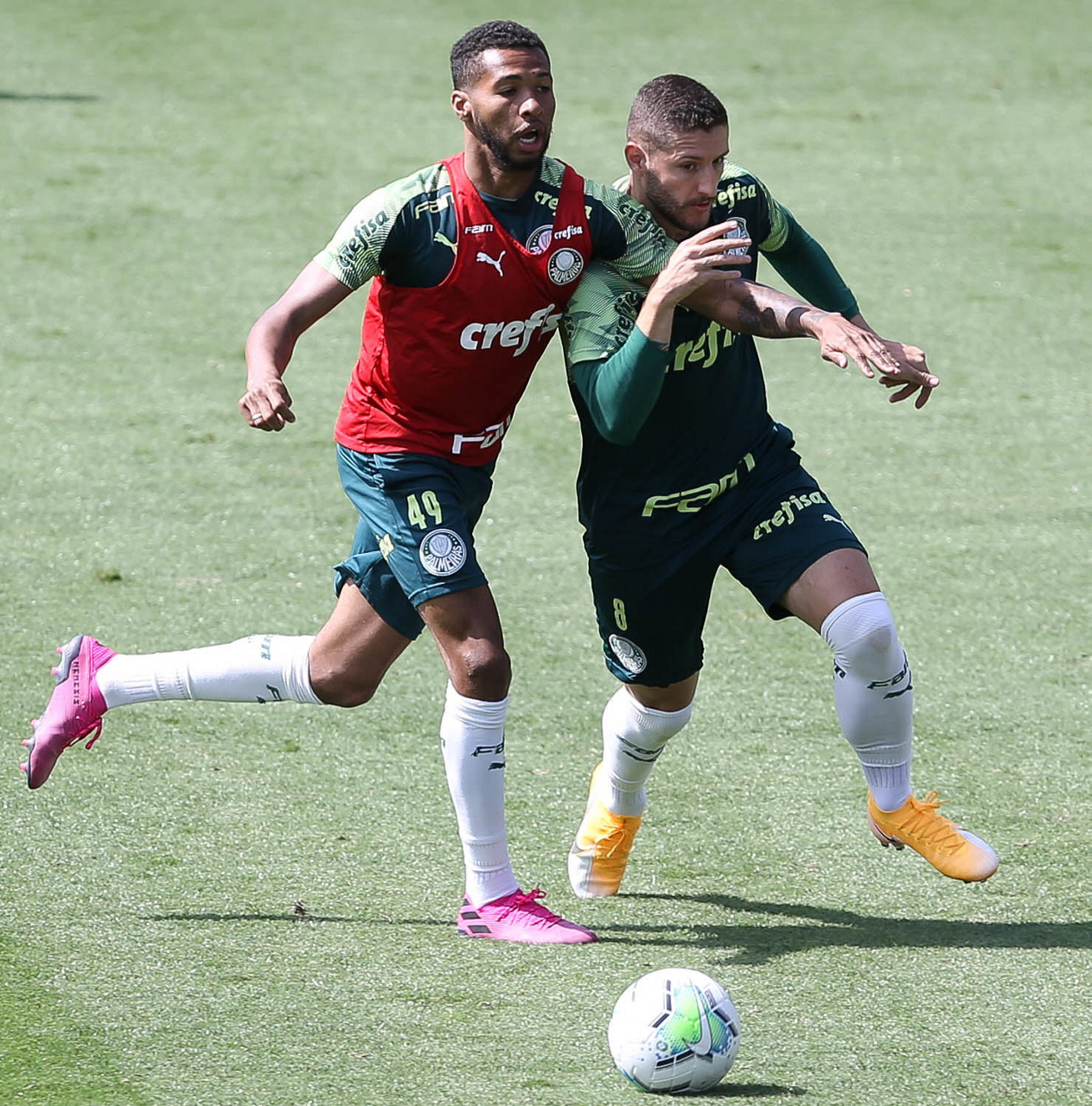 Os jogadores Wesley e Zé Rafael (D), da SE Palmeiras, durante treinamento, na Academia de Futebol. (Foto: Cesar Greco)