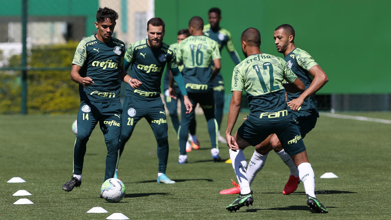 Os jogadores Bruno Henrique e Diogo Barbosa (D), da SE Palmeiras, durante treinamento, na Academia de Futebol. (Foto: Cesar Greco)