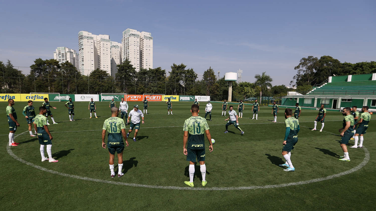 Os jogadores da SE Palmeiras, durante treinamento, na Academia de Futebol. (Foto: Cesar Greco)
