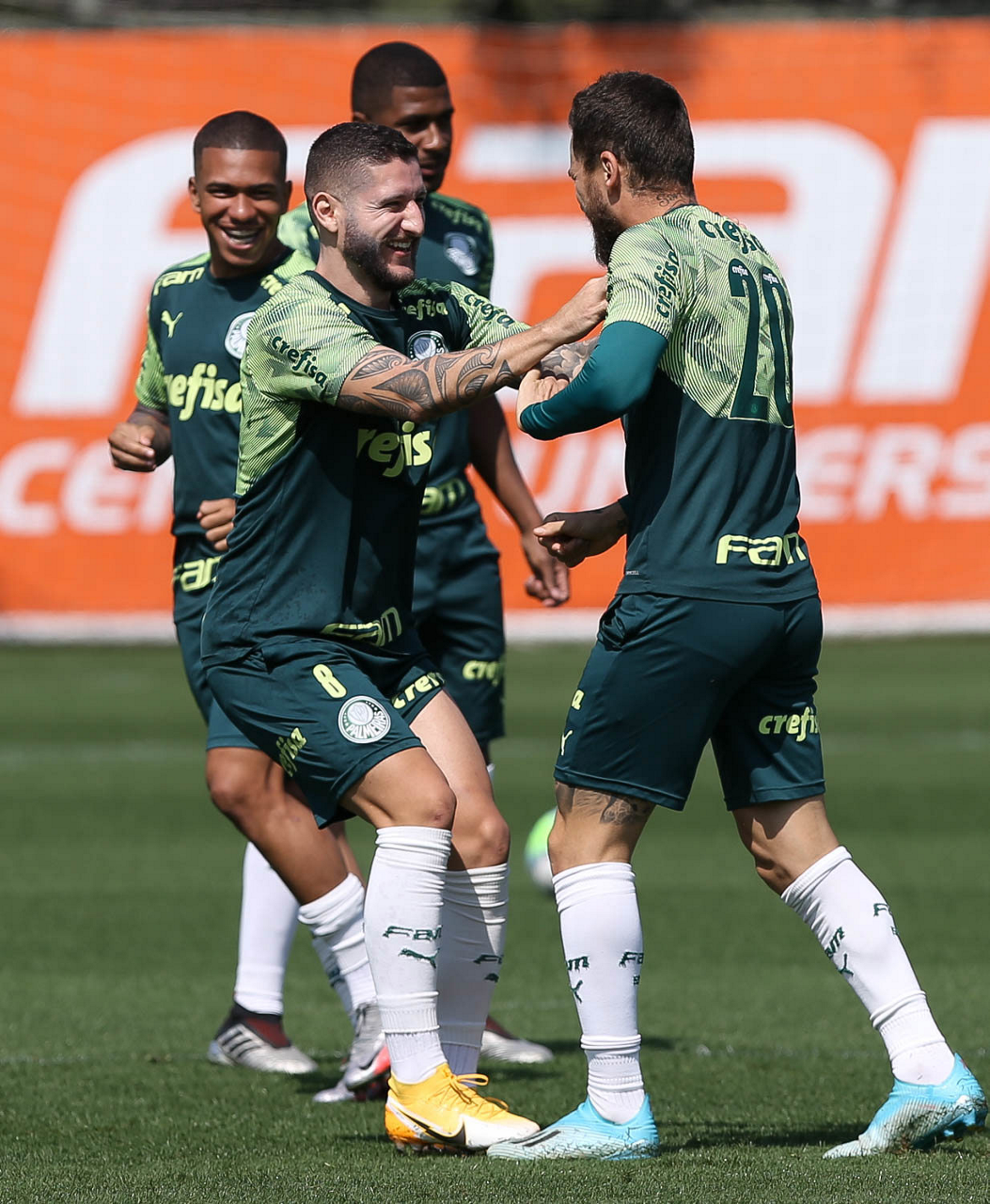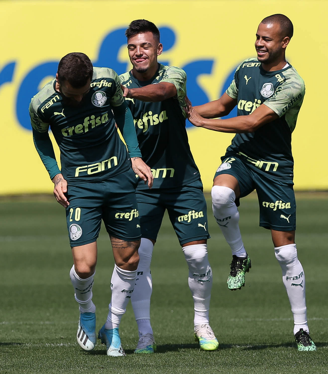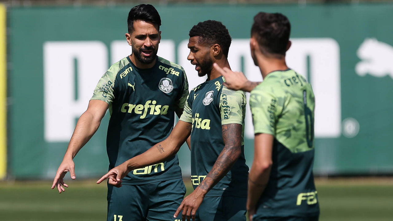 Os jogadores Lucas Lima, Gabriel Menino e Mayke (E/D), da SE Palmeiras, durante treinamento, na Academia de Futebol. (Foto: Cesar Greco)