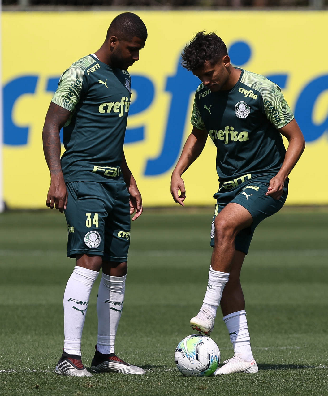 Os jogadores Vitor Hugo e Raphael Veiga (D), da SE Palmeiras, durante treinamento, na Academia de Futebol. (Foto: Cesar Greco)