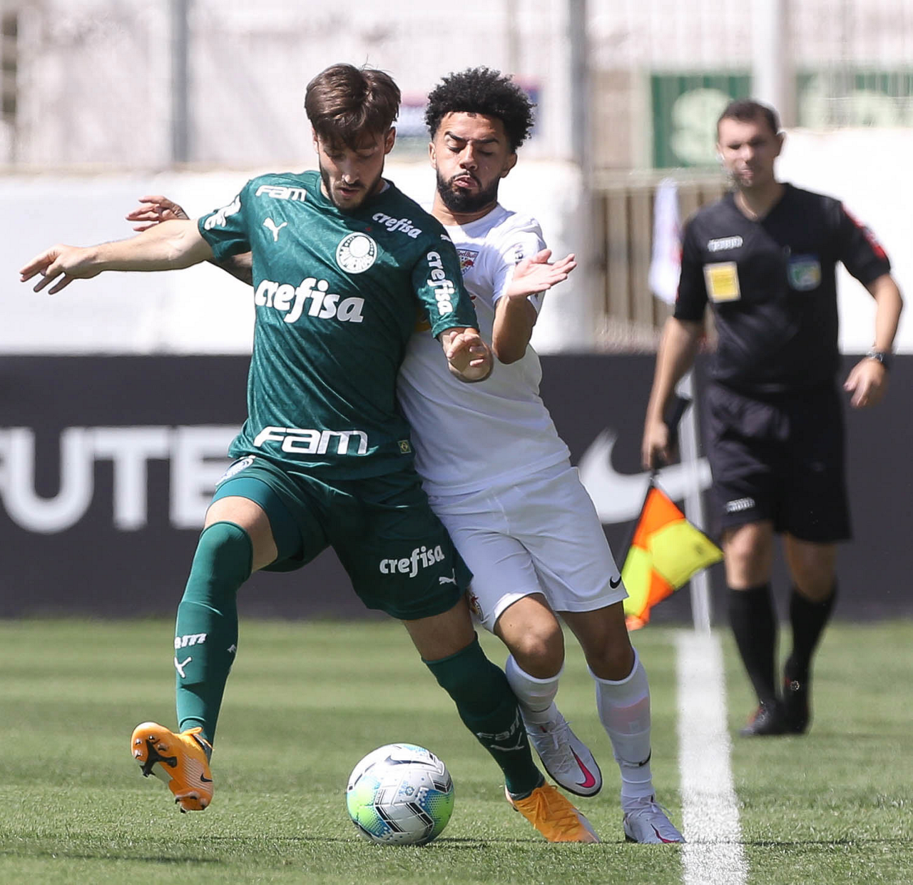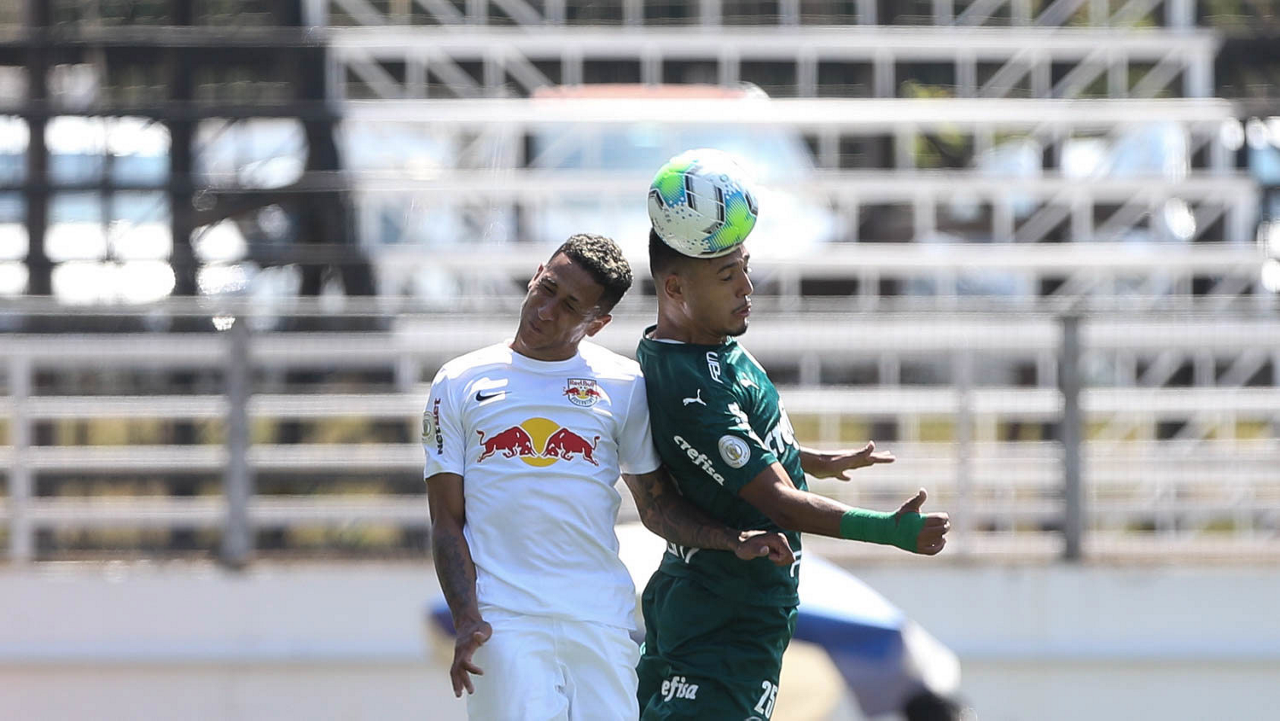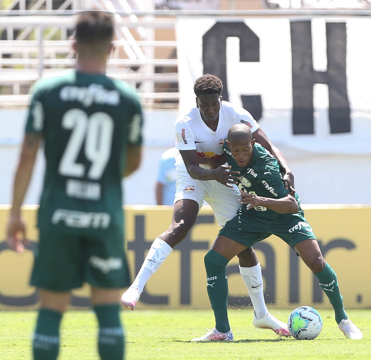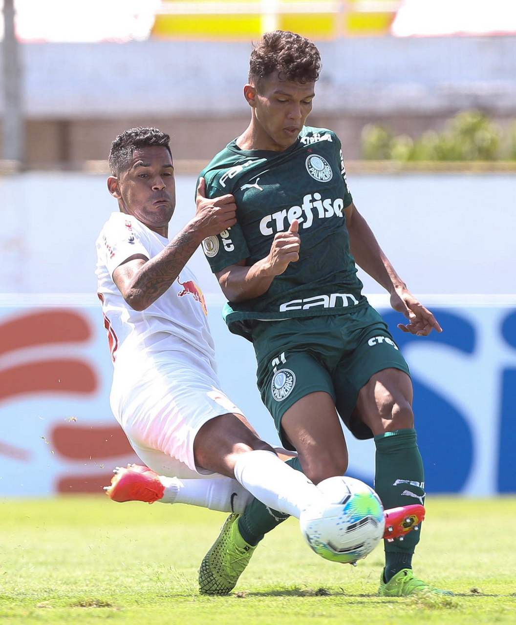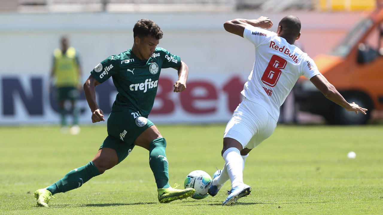O jogador Gabriel Menino, da SE Palmeiras, disputa bola com o jogador Ryller, do Red Bull Bragantino, durante partida válida pela oitava rodada, do Campeonato Brasileiro, Série A, no Estádio Nabi Abi Chedid. (Foto: Cesar Greco)