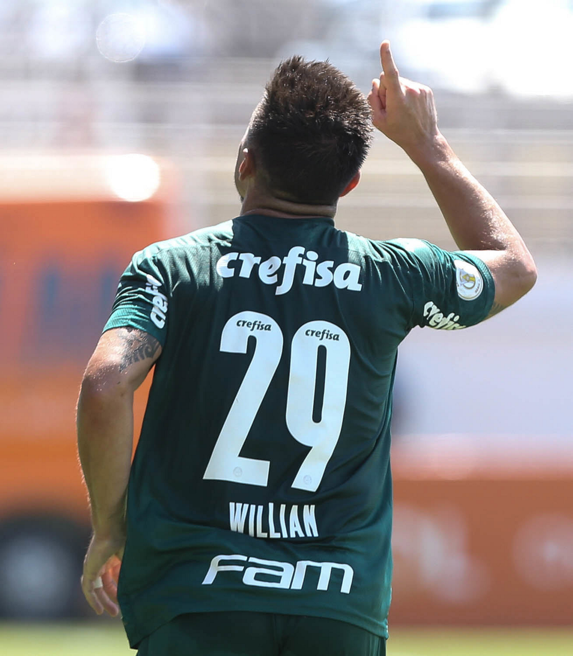 O jogador Willian, da SE Palmeiras, em jogo contra a equipe do Red Bull Bragantino, durante partida válida pela oitava rodada, do Campeonato Brasileiro, Série A, no Estádio Nabi Abi Chedid. (Foto: Cesar Greco)