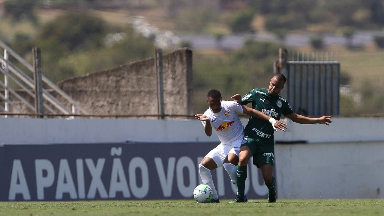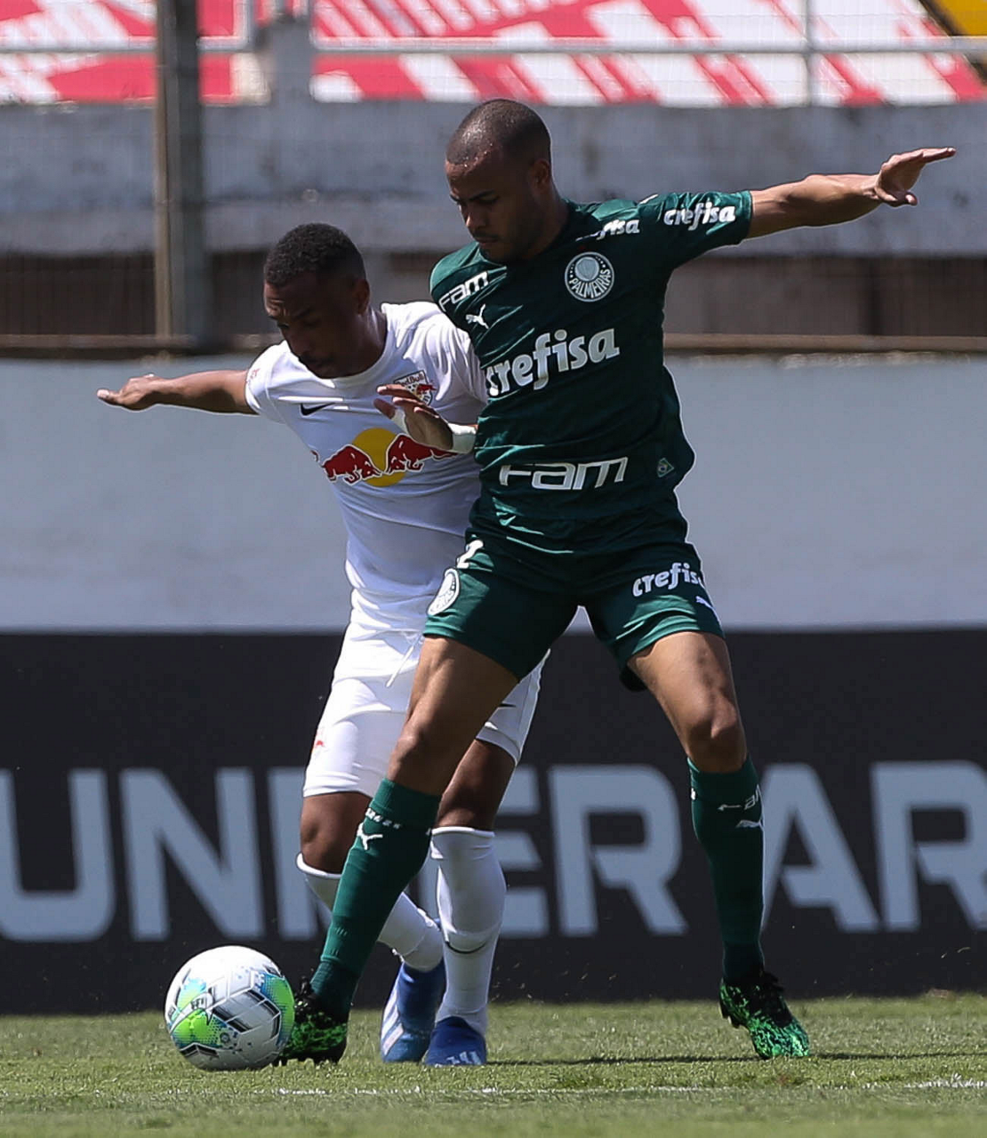 O jogador Gabriel Menino, da SE Palmeiras, disputa bola com o jogador, do Red Bull Bragantino, durante partida válida pela oitava rodada, do Campeonato Brasileiro, Série A, no Estádio Nabi Abi Chedid. (Foto: Cesar Greco)