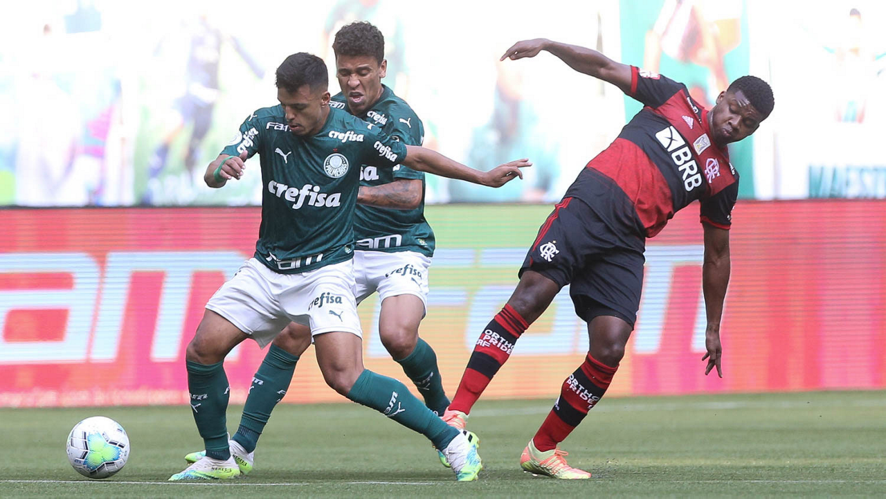 O jogador Gabriel Menino, da SE Palmeiras, disputa bola com o jogador Gerson, do CR Flamengo, durante partida válida pela décima segunda rodada, do Campeonato Brasileiro, Série A, na arena Allianz Parque. (Foto: Cesar Greco)