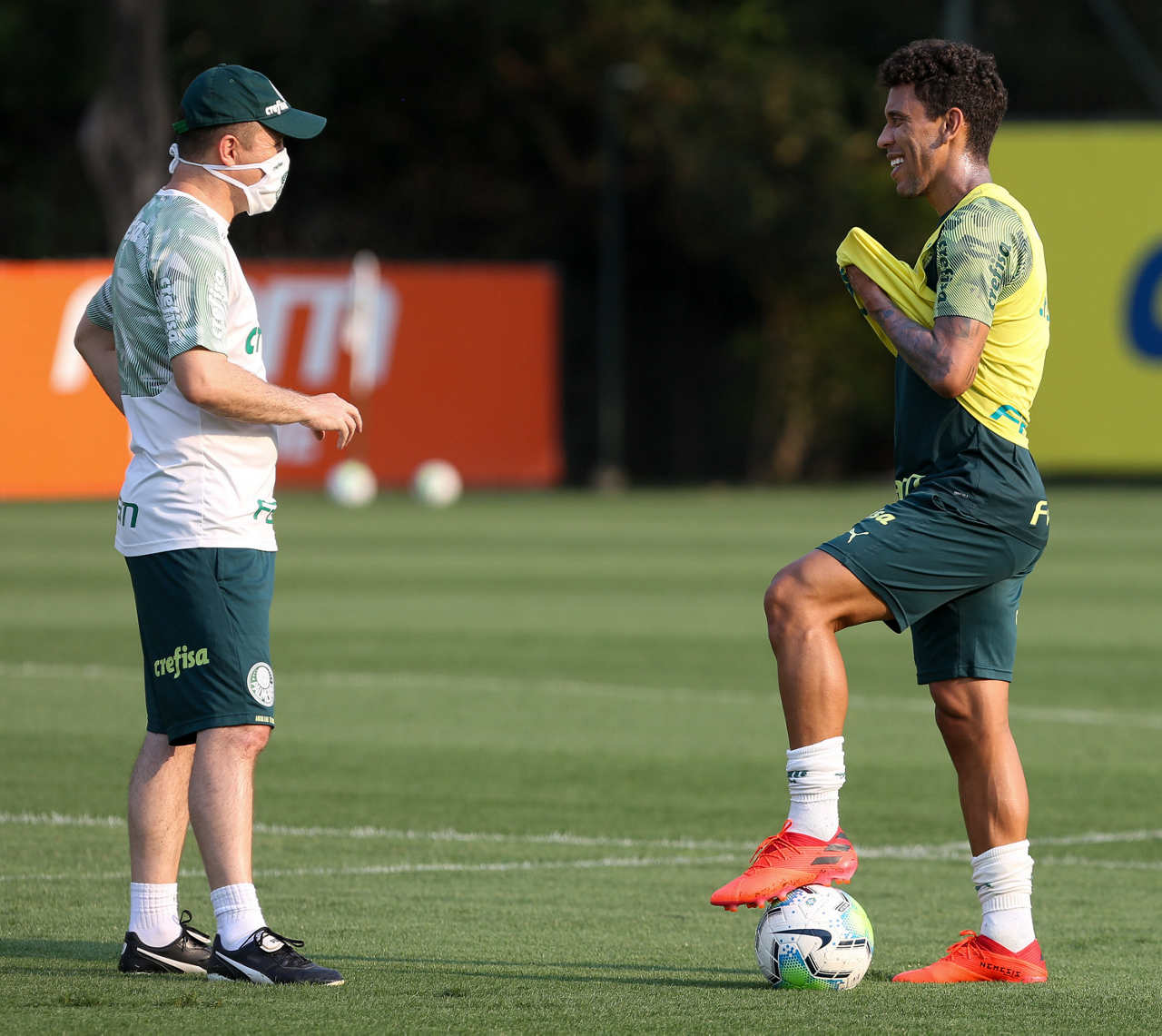 O técnico Vanderlei Luxemburgo e o jogador Matias Viña (D), da SE Palmeiras, durante treinamento, na Academia de Futebol, em São Paulo-SP. (Foto: Fabio Menotti)
