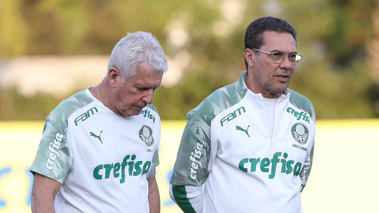 O técnico Vanderlei Luxemburgo e o preparador físico Antônio Mello (E), da SE Palmeiras, durante treinamento, na Academia de Futebol. (Foto: Cesar Greco)