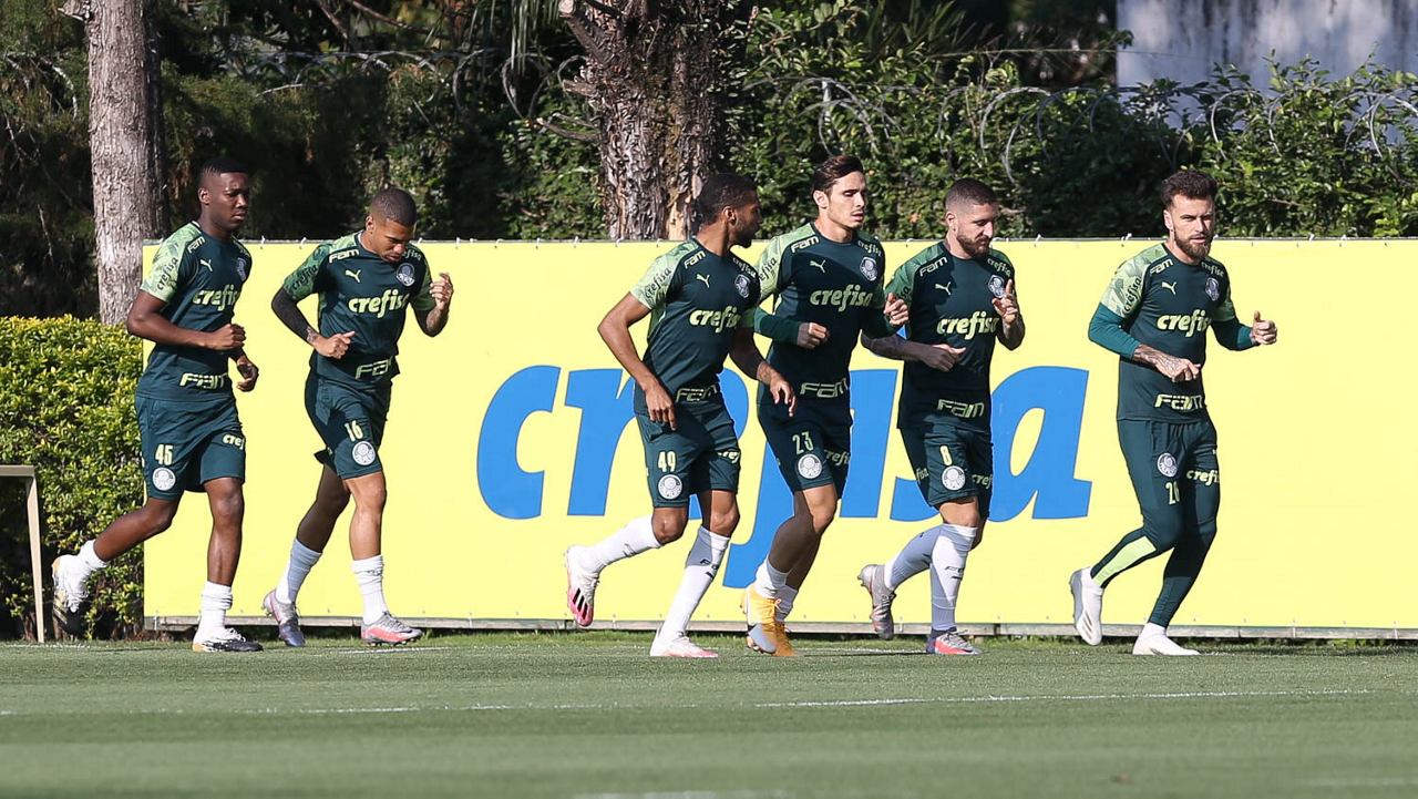 Os jogadores Patrick de Paula, Lucas Esteves, Wesley, Raphael Veiga, Zé Rafael e Lucas Lima (E/D), da SE Palmeiras, durante treinamento, na Academia de Futebol. (Foto: Cesar Greco)