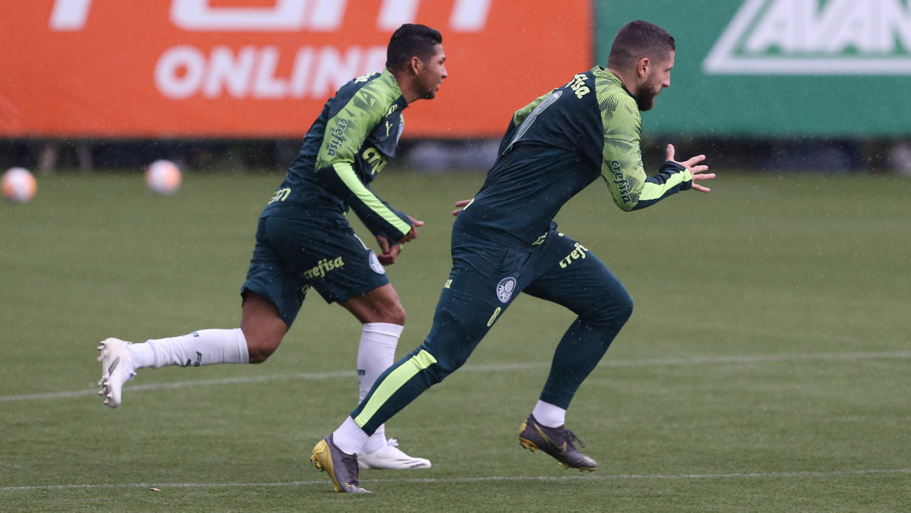Os jogadores Lucas Lima e Emerson Santos (D), da SE Palmeiras, durante treinamento, na Academia de Futebol. (Foto: Cesar Greco)