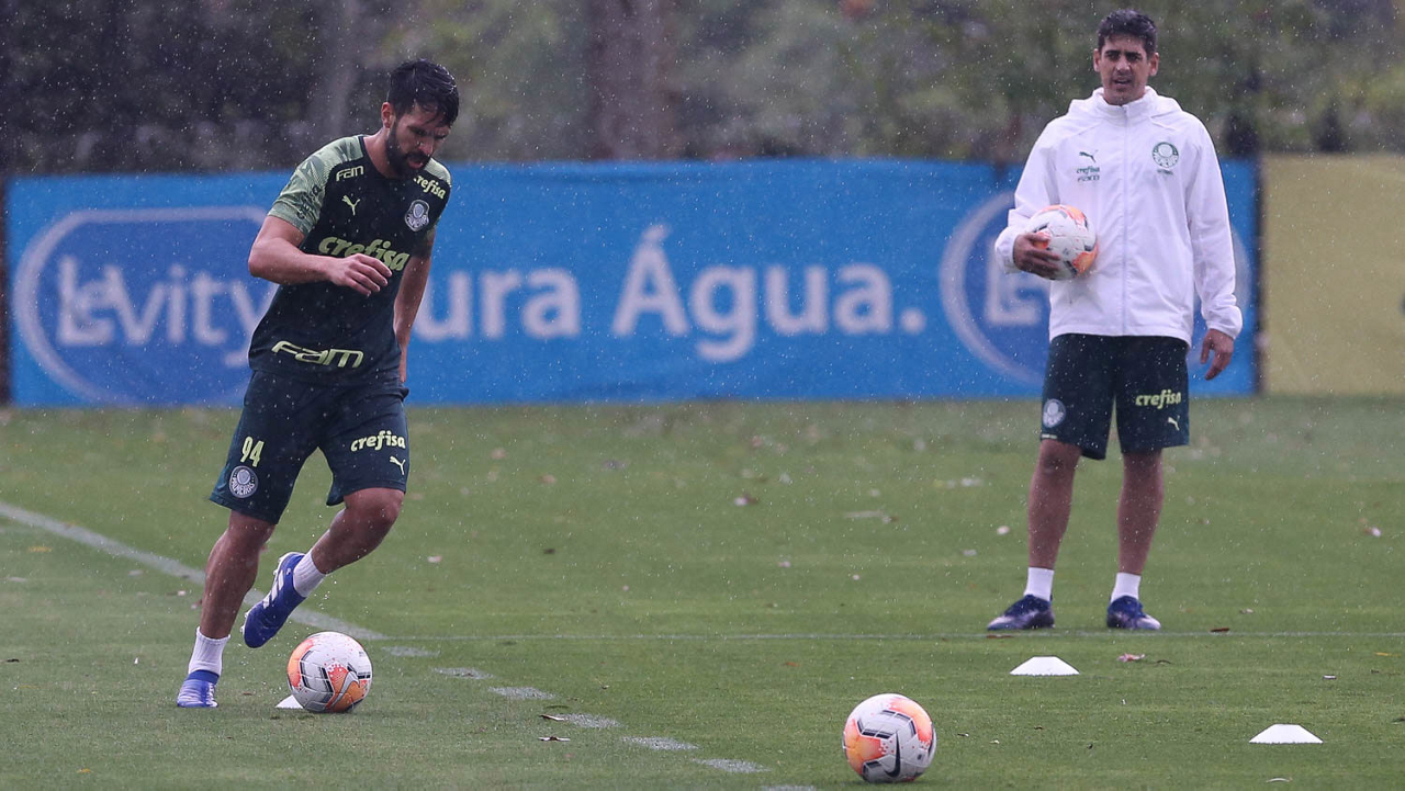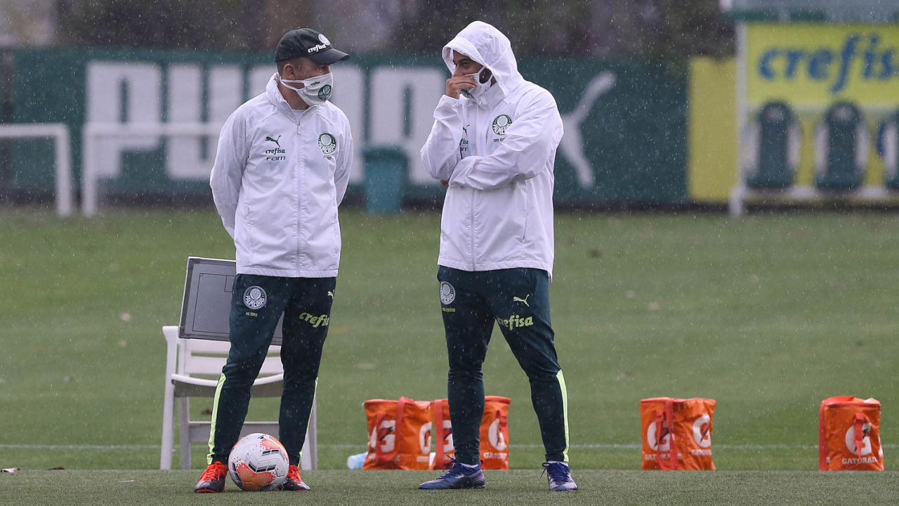 O auxiliar técnico Andrey Lopes e o coordenador científico Daniel Gonçalves (D), da SE Palmeiras, durante treinamento, na Academia de Futebol. (Foto: Cesar Greco)