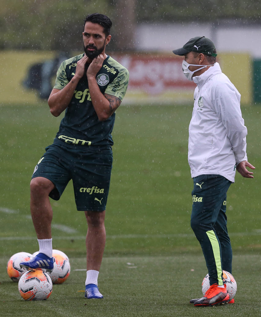 O auxiliar técnico Andrey Lopes e o jogador Luan (E), da SE Palmeiras, durante treinamento, na Academia de Futebol. (Foto: Cesar Greco)