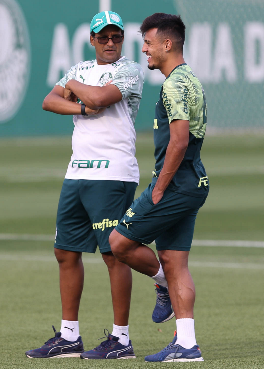 O técnico do Sub-20 Wesley Carvalho e o jogador Gabriel Menino (D), da SE Palmeiras, durante treinamento, na Academia de Futebol. (Foto: Cesar Greco)