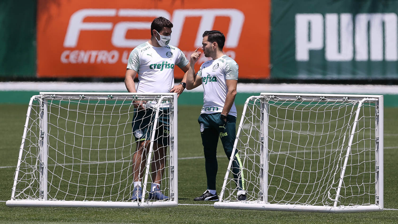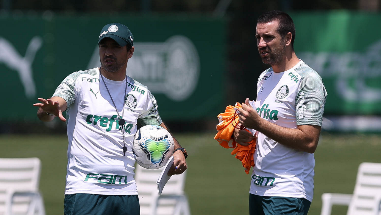 O técnico Abel Ferreira e o preparador físico João Martins (D), da SE Palmeiras, durante treinamento, na Academia de Futebol. (Foto: Cesar Greco)