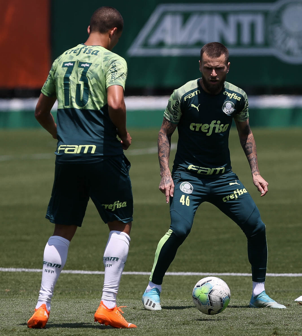 Os jogadores Raphael Veiga e Matías Viña (D), da SE Palmeiras, durante treinamento, na Academia de Futebol. (Foto: Cesar Greco)