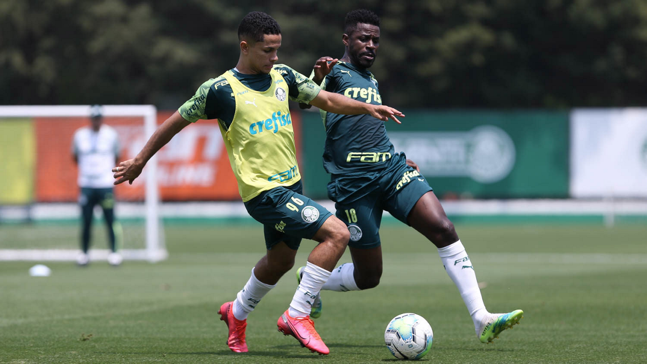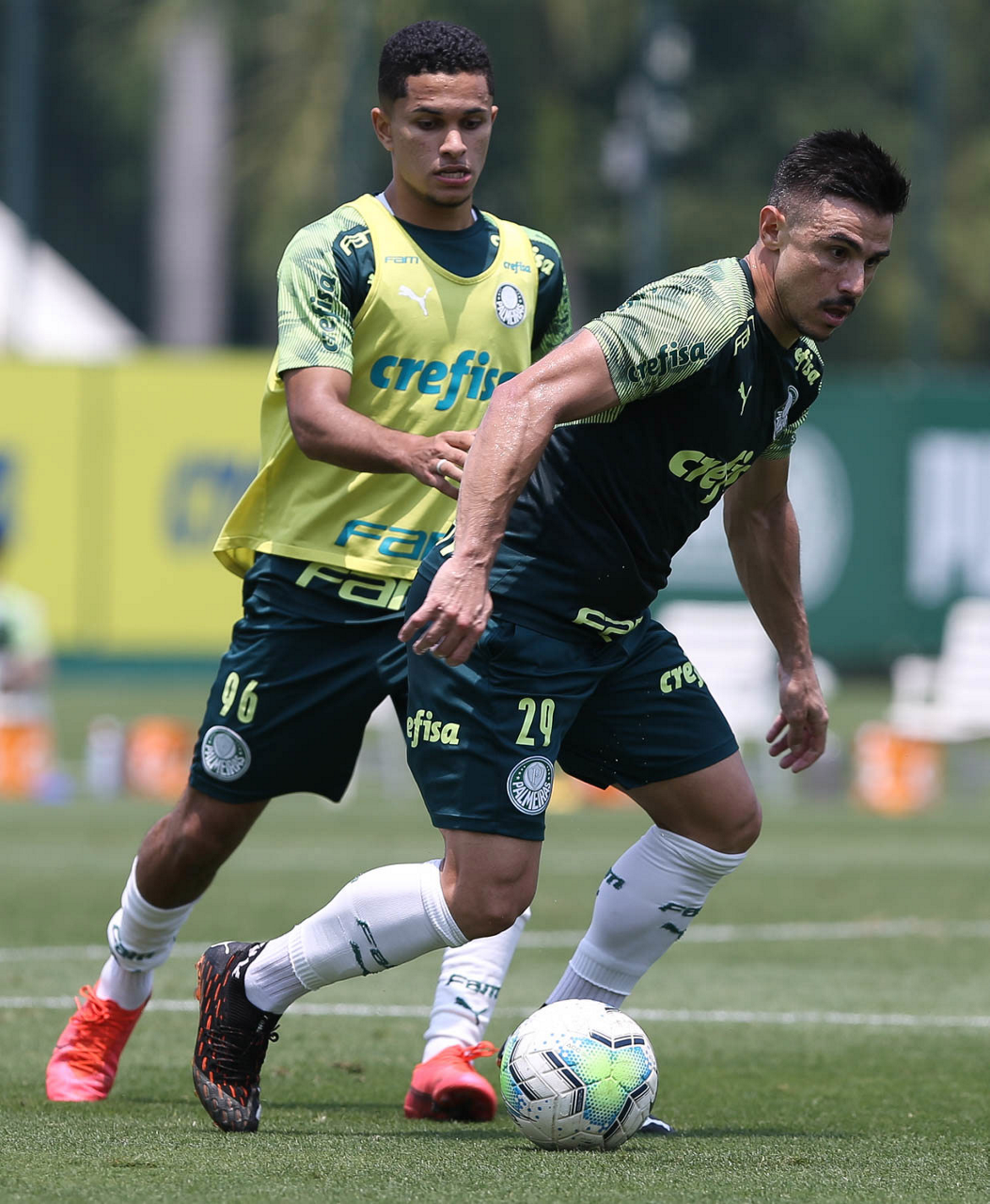 Os jogadores Gabriel Silva e Ramires (D), da SE Palmeiras, durante treinamento, na Academia de Futebol. (Foto: Cesar Greco)